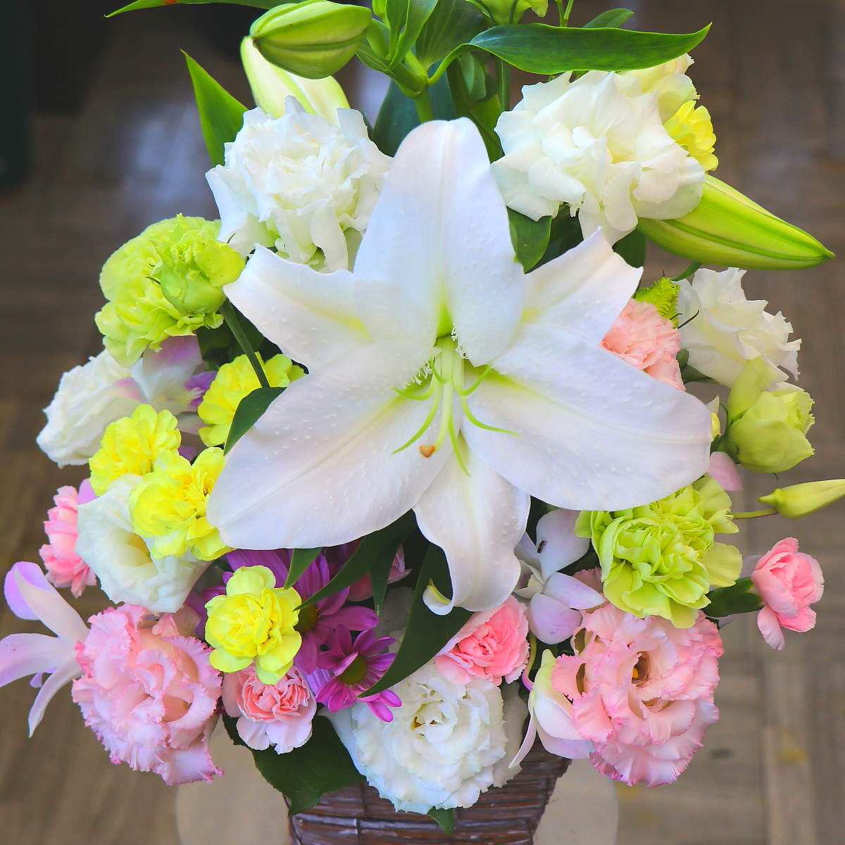 花材: メイン ユリ、キク、カーネーション、トルコギキョウ、デンファレなど その他 葉物類など