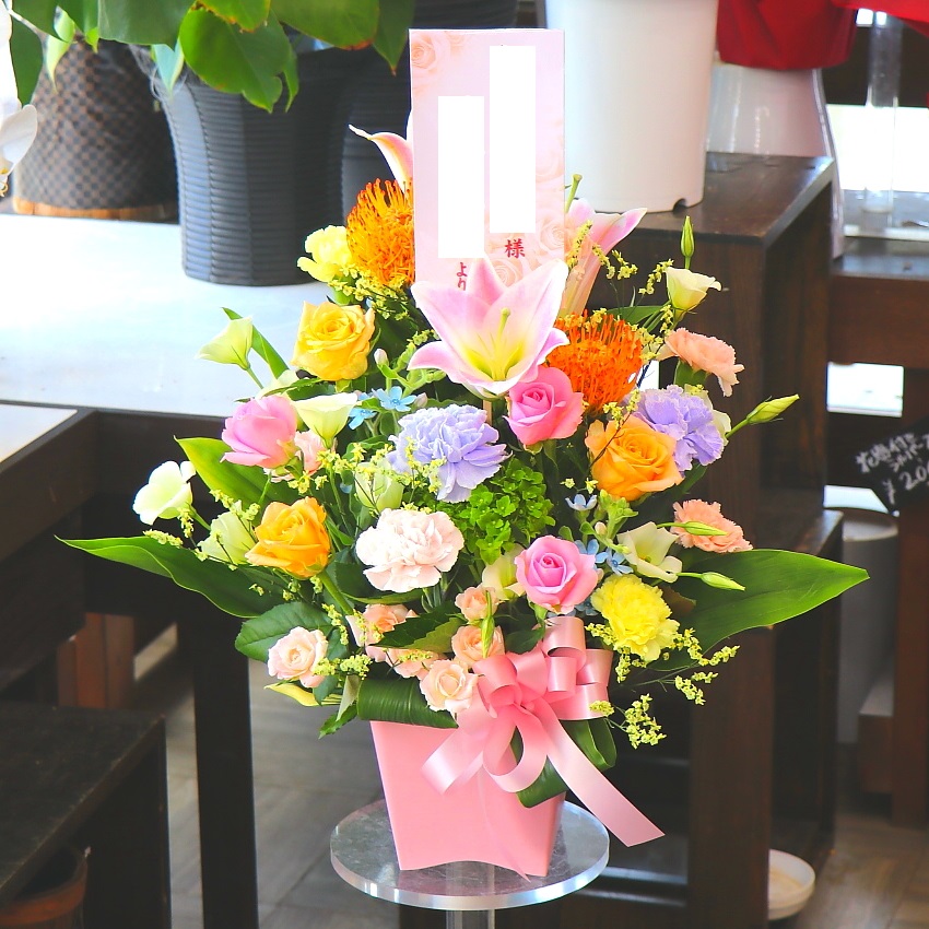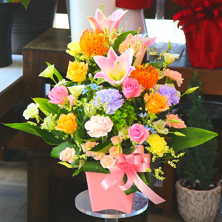 淡いパステル調の色合いをミックスしてまとめたアレンジメント。とても明るいのでさまざまなお祝いシーンへ贈る贈り物として喜ばれますよ。【15時迄のご注文で翌日届きます】※こちらの商品についてのご相談、ご質問等ございましたら(メール)または(お電話)にて承ります。
