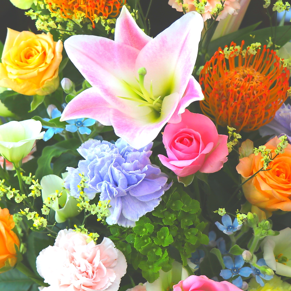 とっても明るい気持ちになるアレンジメントです。存在感のあるユリを中心にバラやカーネーション、トルコギキョウなどを入れて華やかにお作りします。とても上品で明るくリビングやお部屋を彩ります。また、ご利用されたお客様から「大変花持ちが良い」と好評ですよ。あなたの大切な人へ…心を込めてこのアレンジを贈ってみてはいかがですか。
