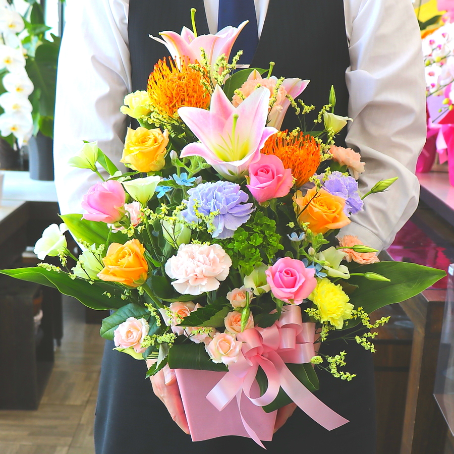 花材: メイン ユリ、バラ、カーネーション、トルコギキョウ、葉物類など その他 ギフト用に綺麗に美しくラッピング致します。