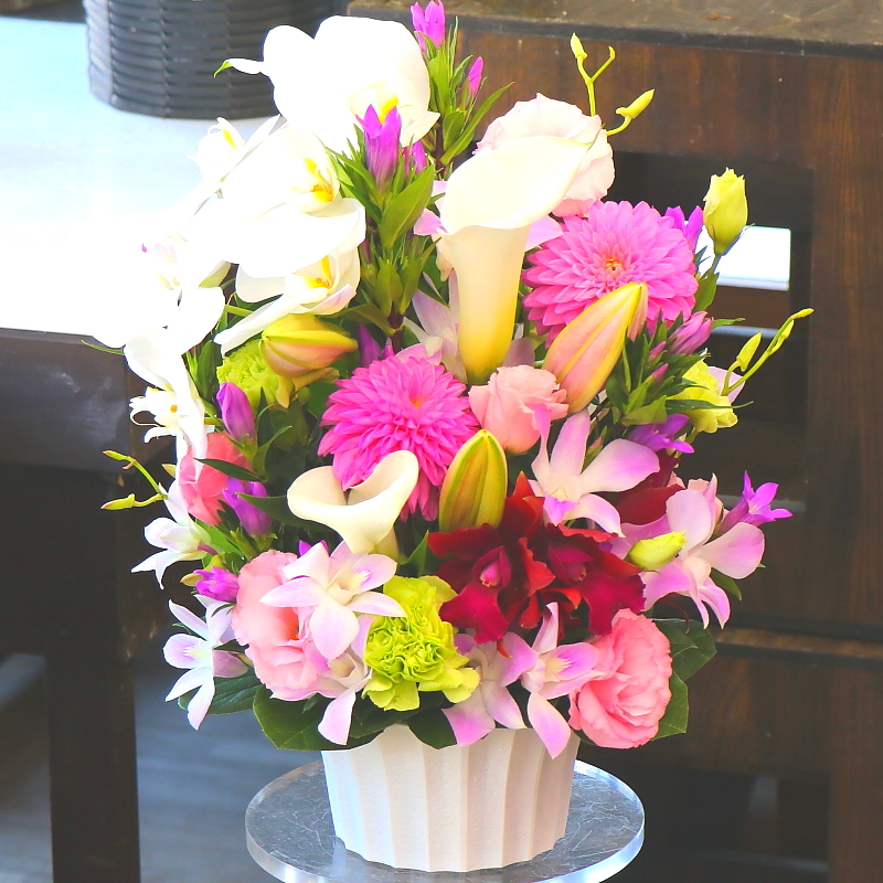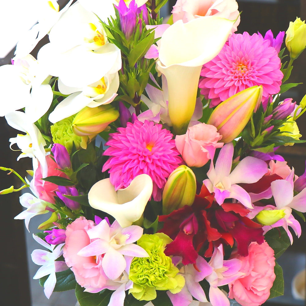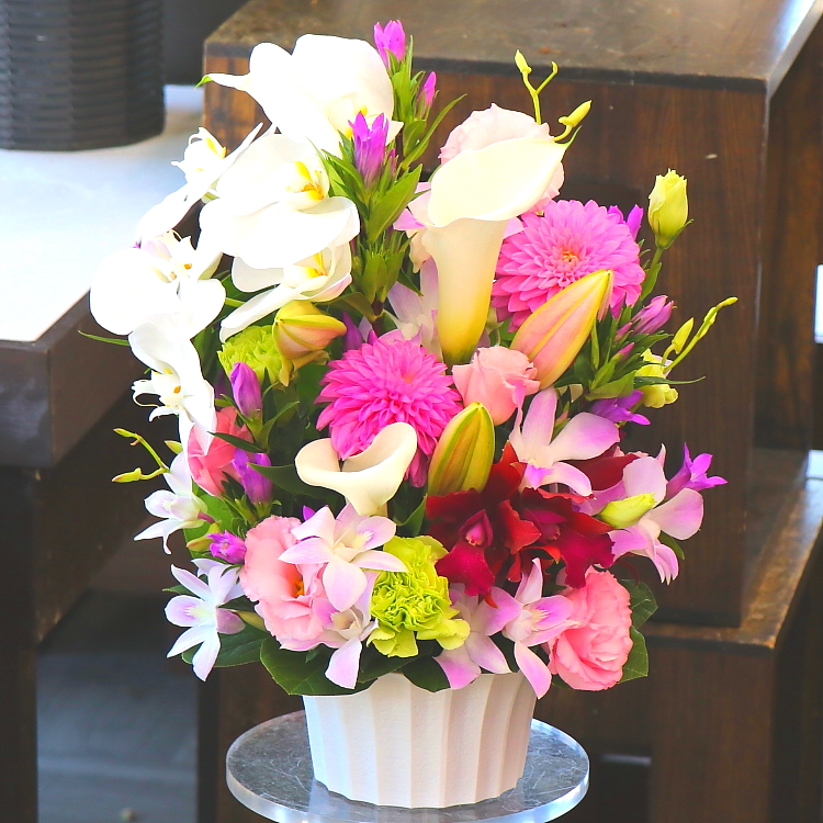 花材: メイン コチョウラン、ユリ、リンドウ、カーネーション、トルコギキョウなど その他 葉物類など