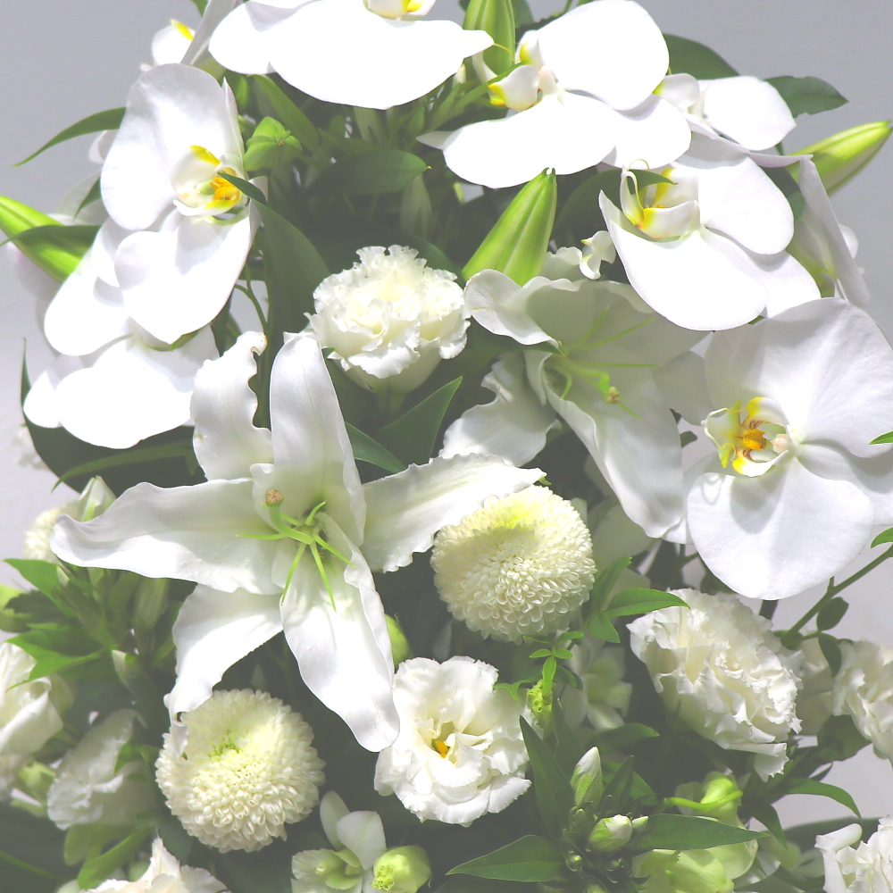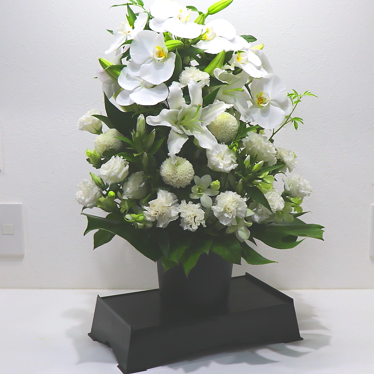 特別な仏事にふさわしいお悔やみアレンジメントです。「コチョウラン」や「ユリ」などの高級なお花を中心にすべて白色でまとめました。供花台付きなのでお供えやお悔やみにふさわしく、丁寧な想いを伝えてくれます。花持ちが良いお花を中心に心を込めてお作りします。目を閉じて心の中にいる故人への想いをそっと呼び起こします。故人への供養はもちろん、ご家族やご遺族様の心を癒すことでしょう。当店では、お客様のその想いをしっかりと受け止め、心を込めて制作致します。故人を偲ぶ色々なシーンで是非、ご利用下さい。