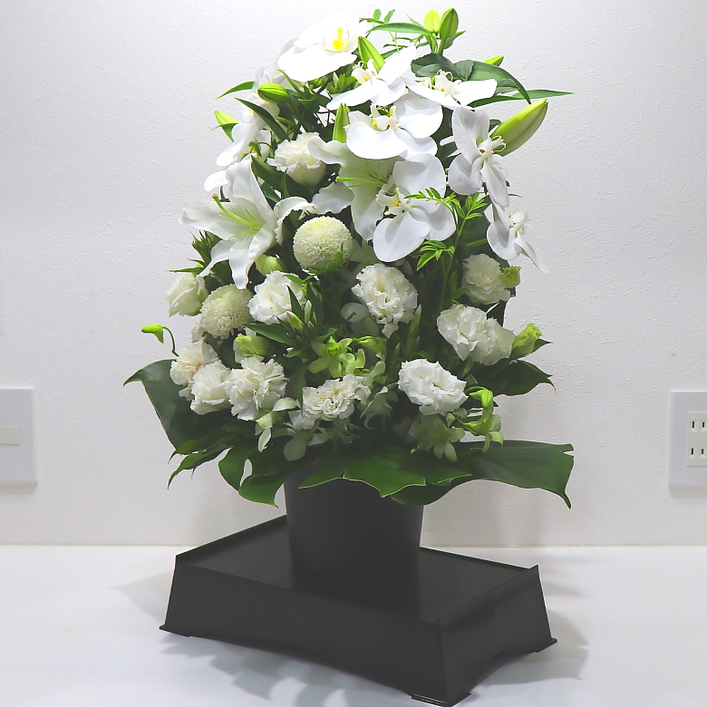 供花台付きのしっかりとお気持ちを伝えるお悔やみアレンジメント。白上がりに上品に制作致します。亡くなってから日が浅い故人様への贈り物にいかがですか。また、枕花にもおススメです。ご家族様やご遺族様の気持ちに寄り添うように丁寧に心をお届けします。【15時迄のご注文で翌日届きます】※こちらの商品についてのご相談、ご質問等ございましたら(メール)または(お電話)にて承ります。