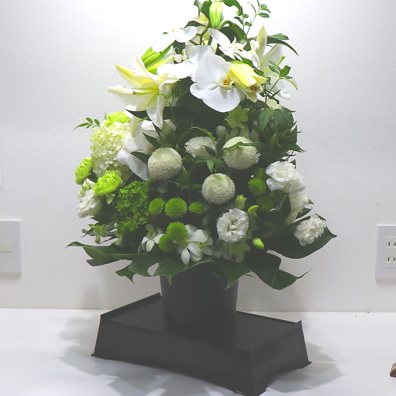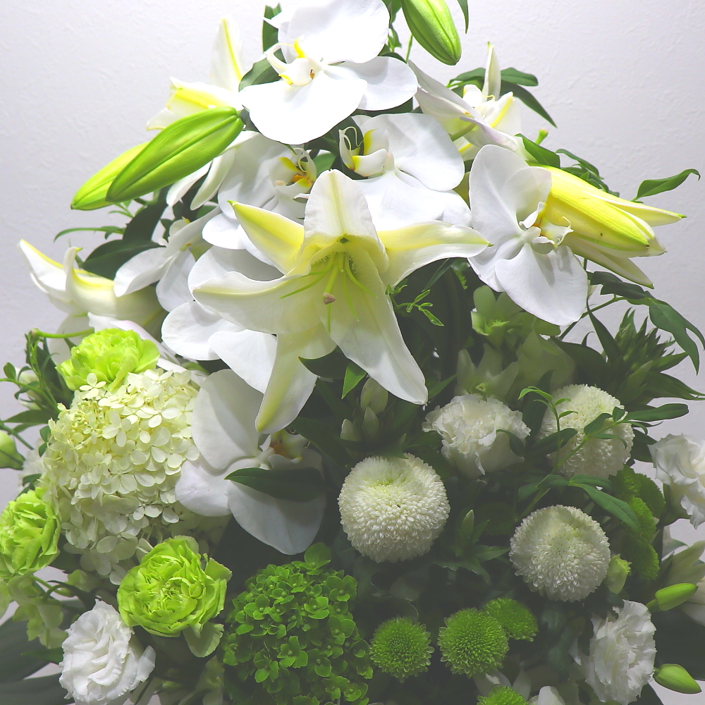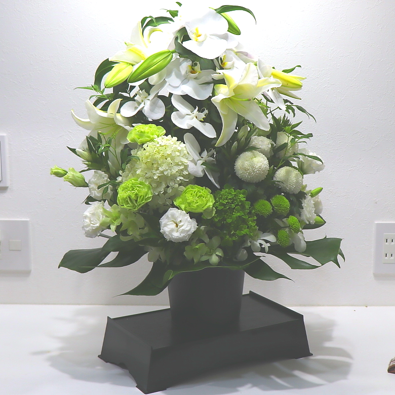 特別な仏事にふさわしいお悔やみアレンジメントです。「コチョウラン」や「ユリ」などの高級なお花を中心にすべて白&グリーン系でまとめました。供花台付きなのでお供えやお悔やみにふさわしく、丁寧な想いを伝えてくれます。花持ちが良いお花を中心に心を込めてお作りします。目を閉じて心の中にいる故人への想いをそっと呼び起こします。故人への供養はもちろん、ご家族やご遺族様の心を癒すことでしょう。当店では、お客様のその想いをしっかりと受け止め、心を込めて制作致します。故人を偲ぶ色々なシーンで是非、ご利用下さい。