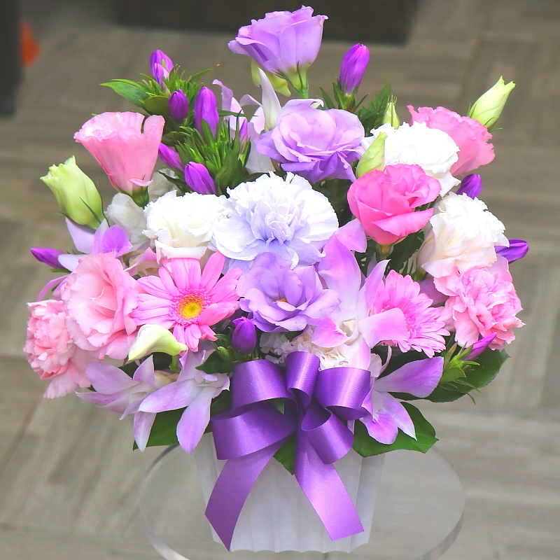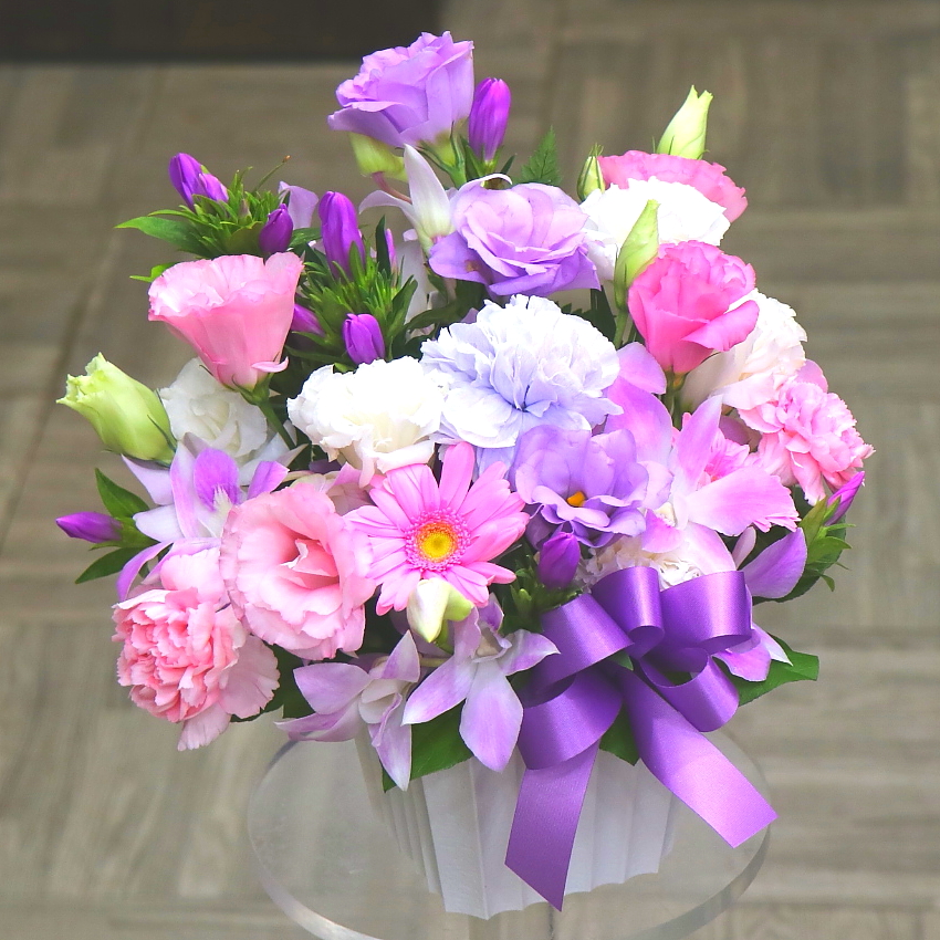 ピンク&パープル系の明るい色合いのお悔やみアレンジメント。可愛らしかった故人へ、亡くなってもう何年も経った方への故人を偲ぶ贈り物にいかがでしょうか。【15時迄のご注文で翌日届きます】※こちらの商品についてのご相談、ご質問等ございましたら(メール)または(お電話)にて承ります。