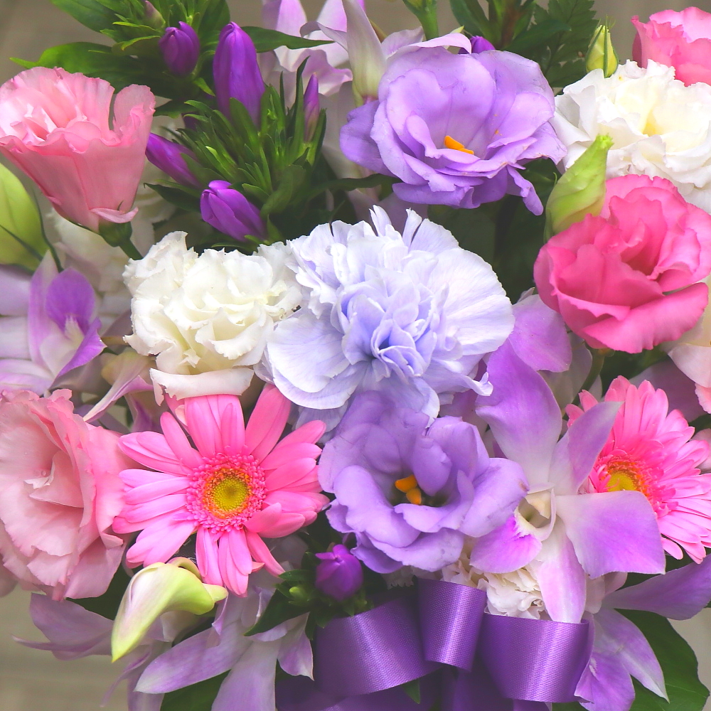 ピンクとパープル系の明るめな色合いがとても素敵なお悔やみアレンジメントです。リンドウやカーネーション、トルコギキョウなどの花材を中心に上品にお作りします。花持ちも良く、この時期のお供え・お悔やみ用途にいかがでしょうか。目を閉じて心の中にいる故人への想いをそっと呼び起こします。故人への供養はもちろん、ご家族やご遺族様の心を癒すことでしょう。当店では、お客様のその想いをしっかりと受け止め、心を込めて制作致します。故人を偲ぶ色々なシーンで是非、ご利用下さい。