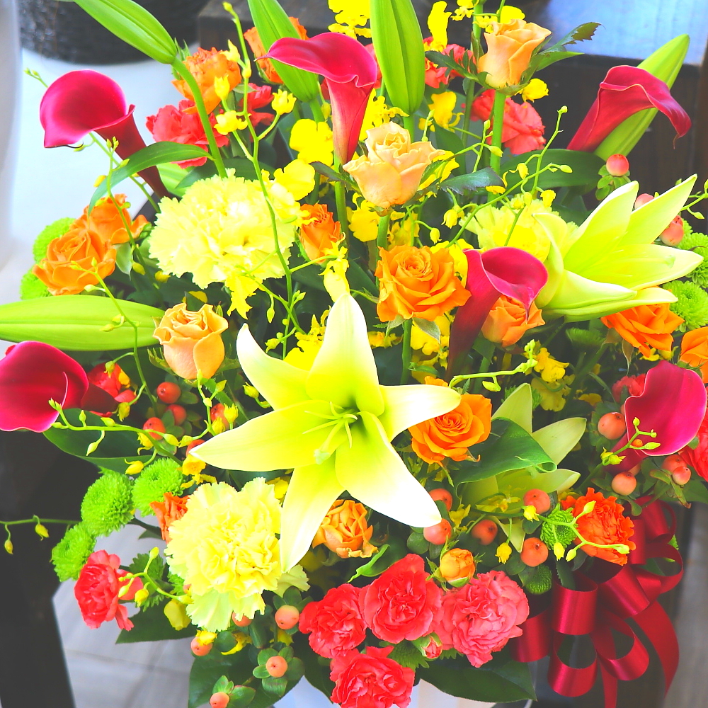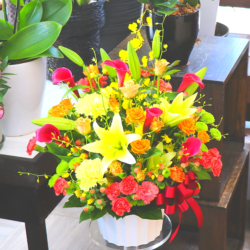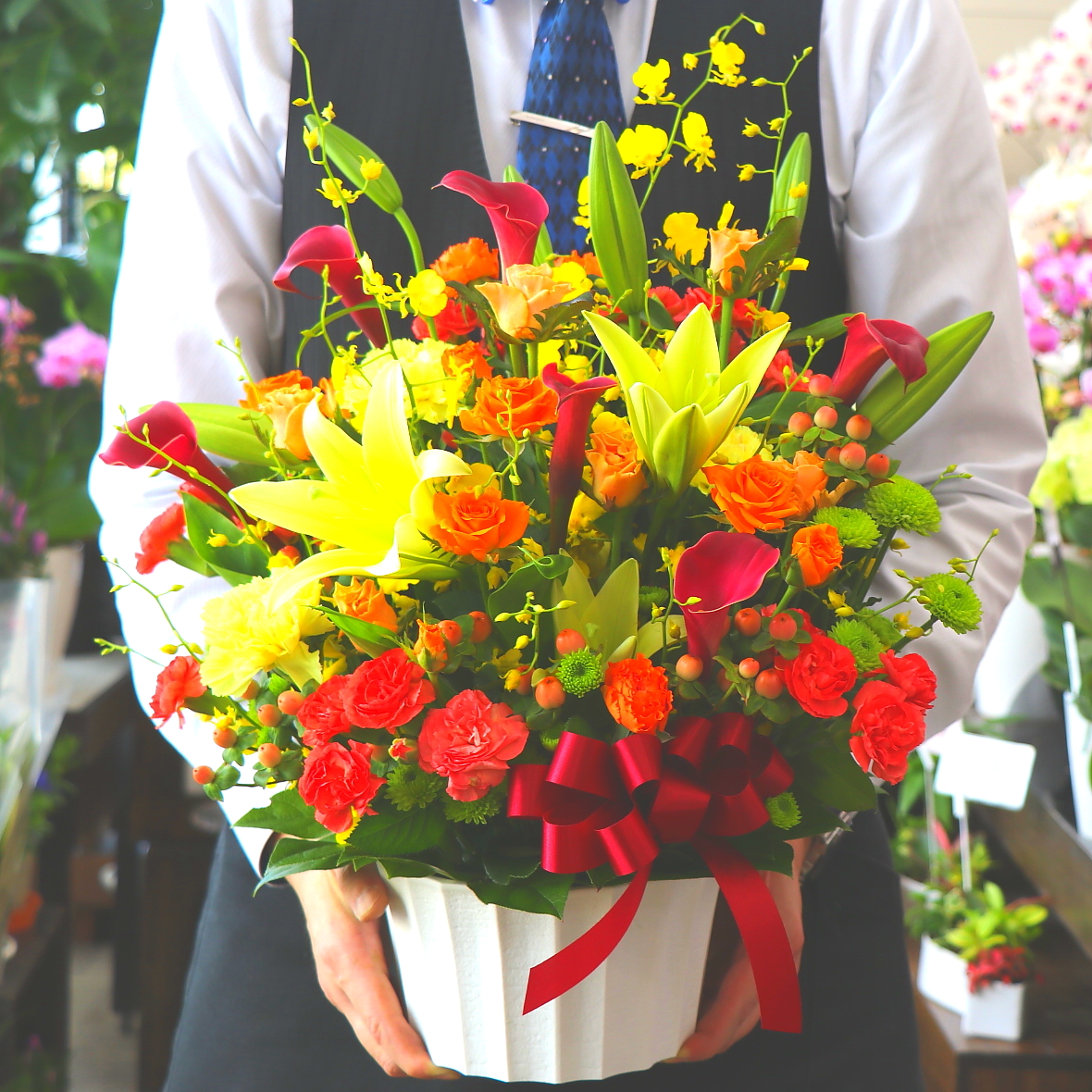 ユリやバラを中心とした黄色&オレンジ系の華やかなアレンジメントです。その季節のお花と合わせて上品にお作りします。また、持ちの良いお花を中心に使っておりますので花持ちも良いでしょう。ご購入されたお客様から高い評価を頂いております。静岡県長泉町から日本全国【真心】込めてお届けいたします。さまざまなご用途に贈る贈り物としてオススメです。大切な方へ贈るフラワーギフトやプレゼントなら「花樹園オンラインドットコム」に是非、お任せ下さいませ。