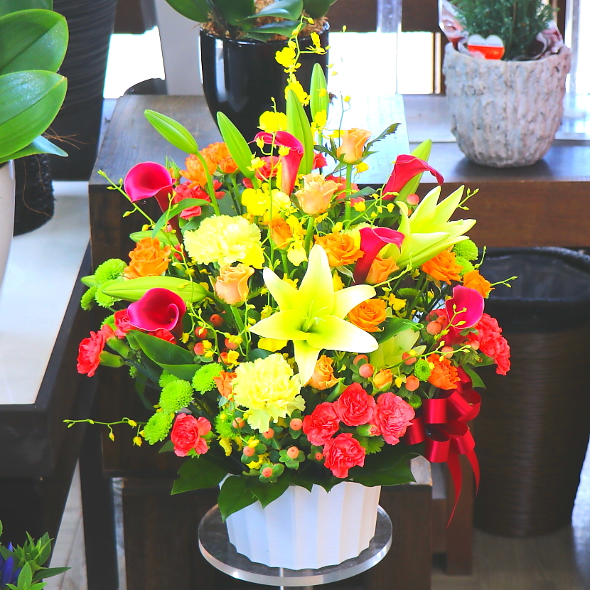 花材: メイン ユリ、カラー、バラ、カーネーションなど その他 実物類、葉物類など