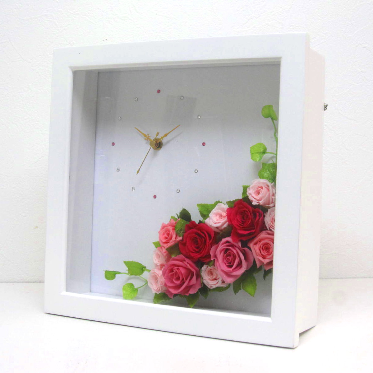 シンプルな白いフレームにスワロフスキーで模った素敵な時計にプリザーブドフラワーをアレンジしました。このまま置いて飾っても素敵ですし、壁にかけても素敵です。(電池と壁掛け用の紐も付いています)しかも1年間有効の保証書付きなので万が一の時も安心です。ラッピングも専用ギフトBOXに入れて素敵にラッピング致します。大切な方に、言葉では照れくさい想いをきっと届けてくれるプリザーブドフラワーです。当店ではお客様の想い大切に【こころを込めて】お作りいたします。是非、さまざまな贈り物に。