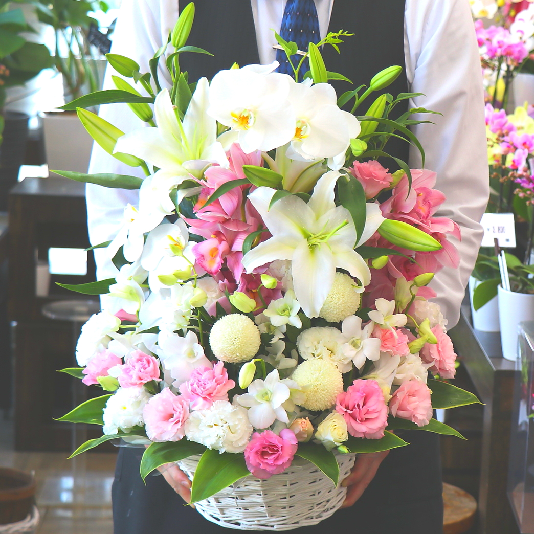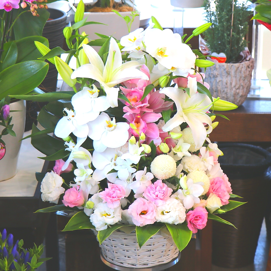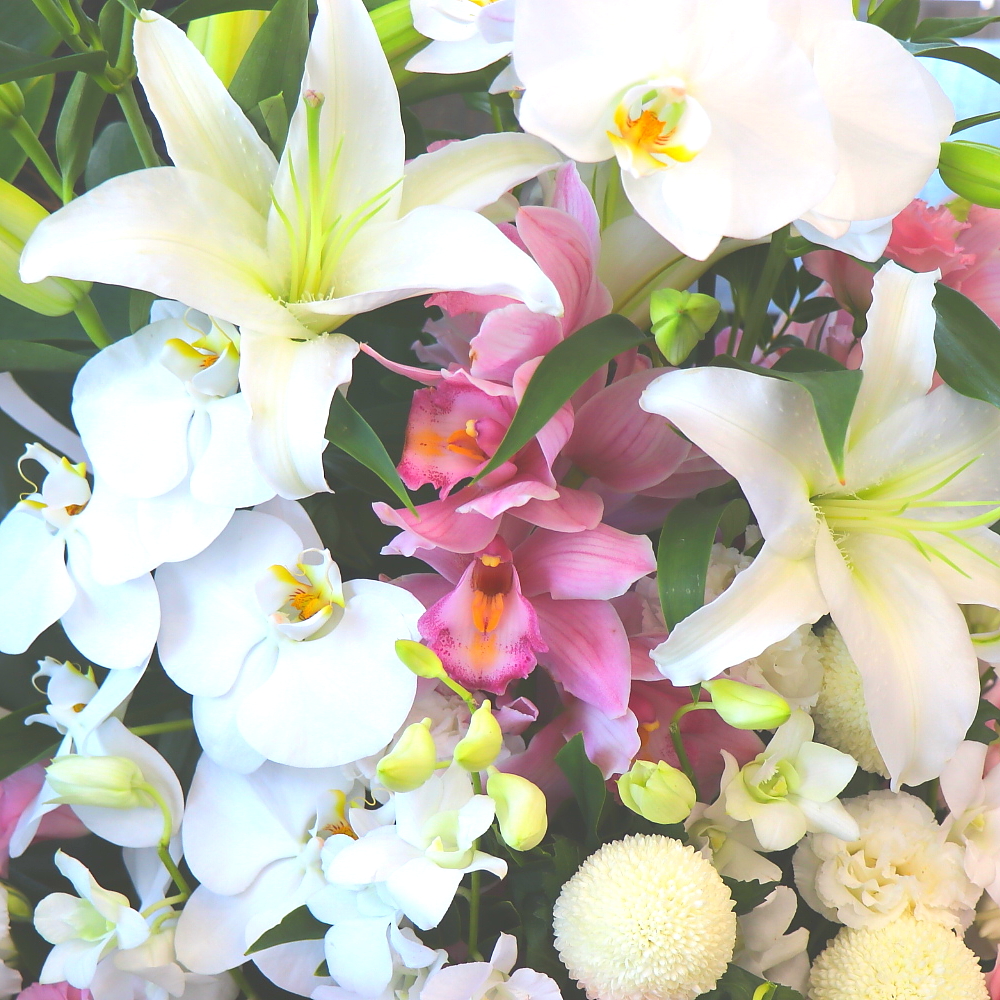 花材: メイン コチョウラン、シンビジューム、ユリ、マム、カーネーション、トルコギキョウ、デンファレなど その他 葉物類など