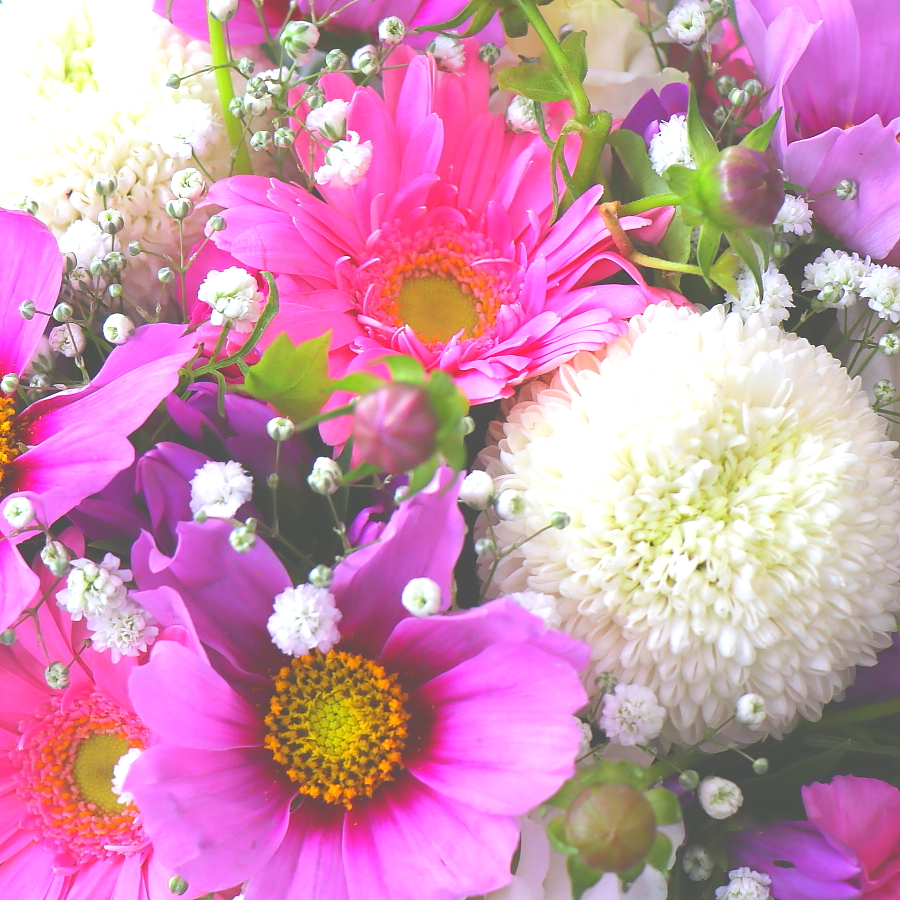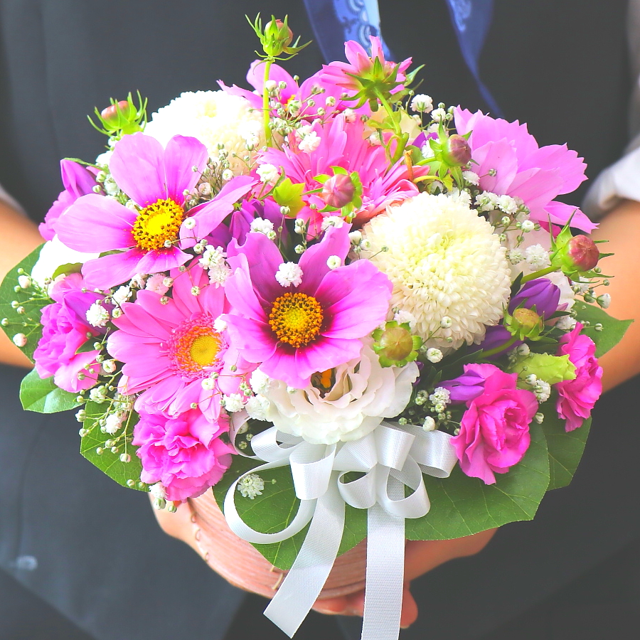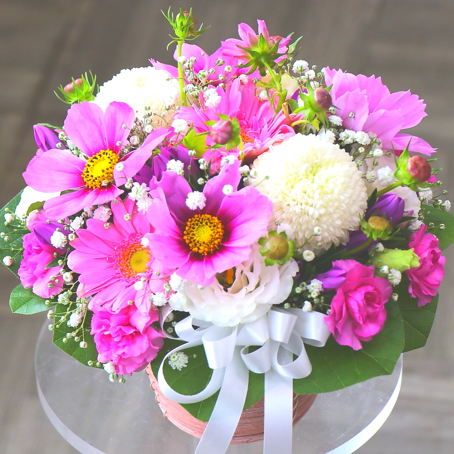 花材: メイン コスモス、リンドウ、マム、ガーベラ、トルコギキョウ、SPカーネーションなど その他 葉物類など