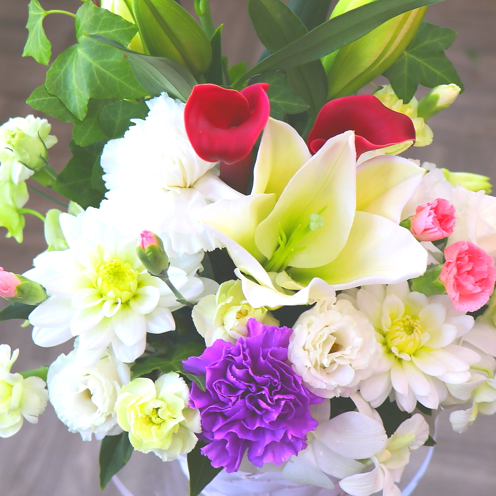 花材: メイン ユリ、カラー、ダリア、トルコギキョウ、カーネーション(ムーンダスト)など その他 葉物類など