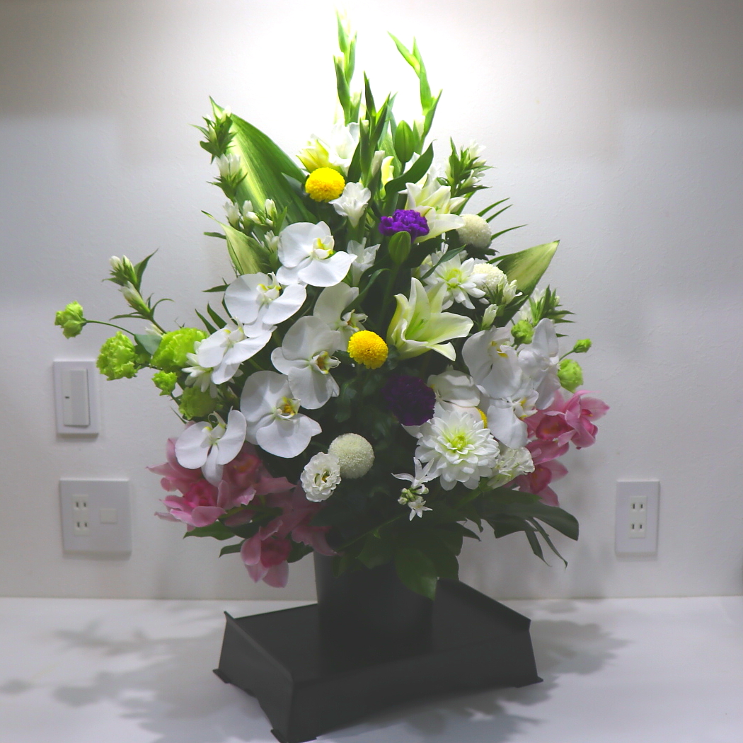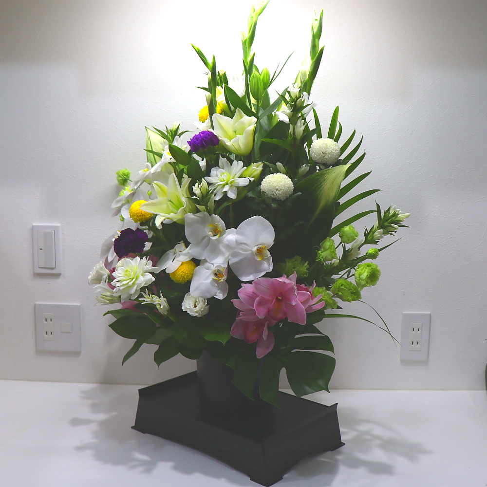 花材: メイン ユリ、リンドウ、マム、コチョウラン、トルコギキョウ、カーネーション、ダリア、シンビジュームなど その他 葉物類など