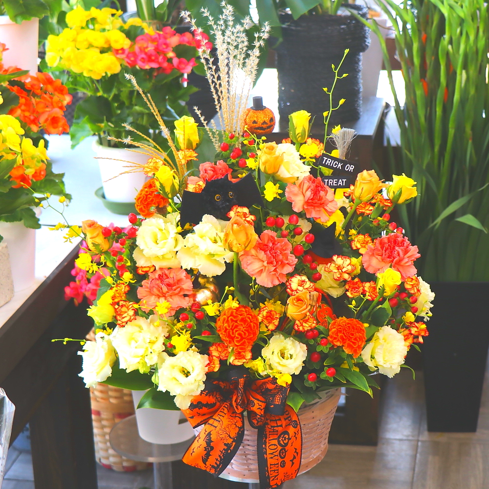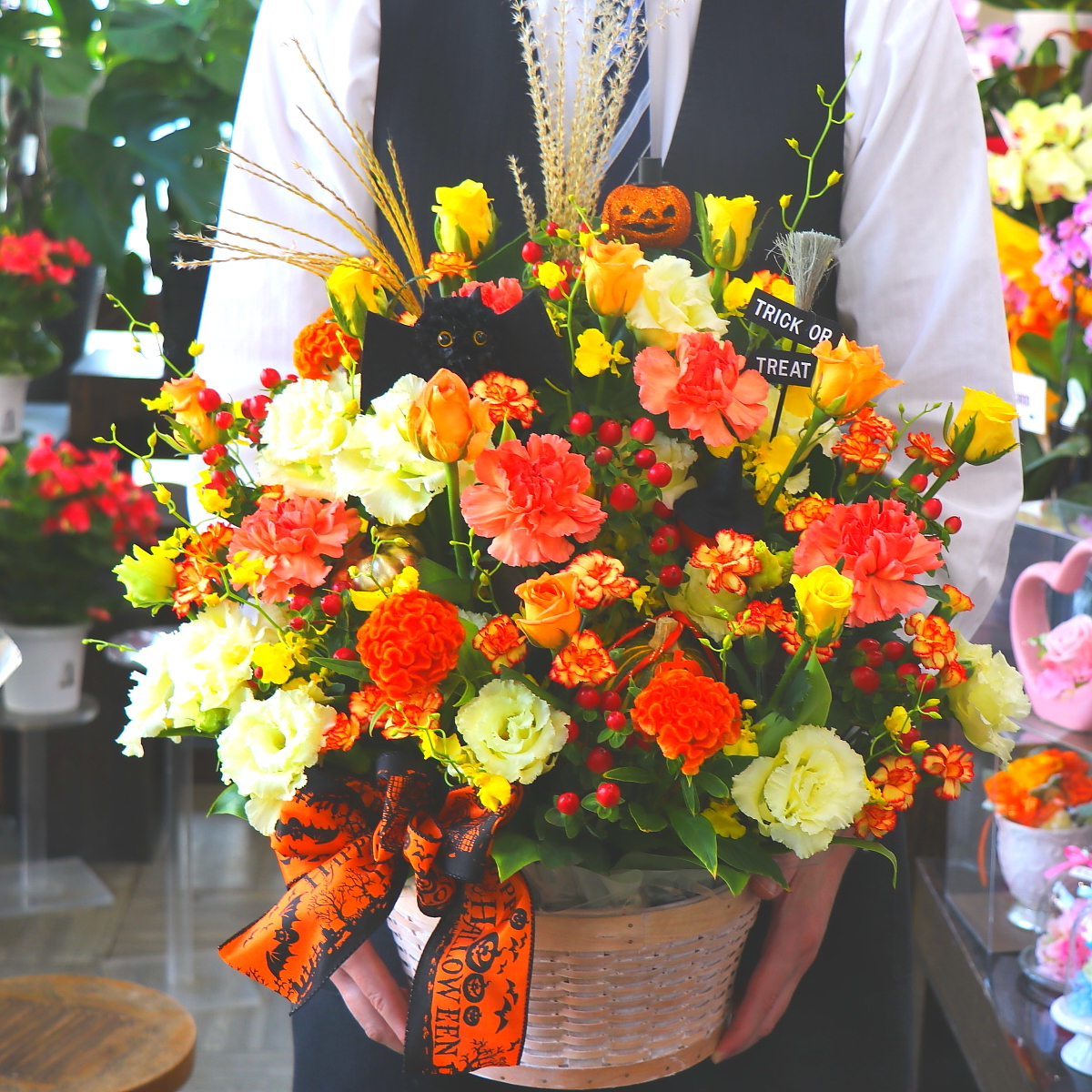 スタンダードなお祝いスタイルを豪華なハロウィンアレンジメントにしました。黄色&オレンジ系の秋の色合いが大切なアニバーサリーをきっと祝福してくれますよ。また、ご利用されたお客様から「大変花持ちが良い」と好評をいただいております。静岡県長泉町から日本全国【真心】込めてお届けいたします。さまざまなご用途に贈る贈り物としてオススメです。大切な方へ贈るフラワーギフトやプレゼントなら「花樹園オンラインドットコム」に是非、お任せ下さいませ。