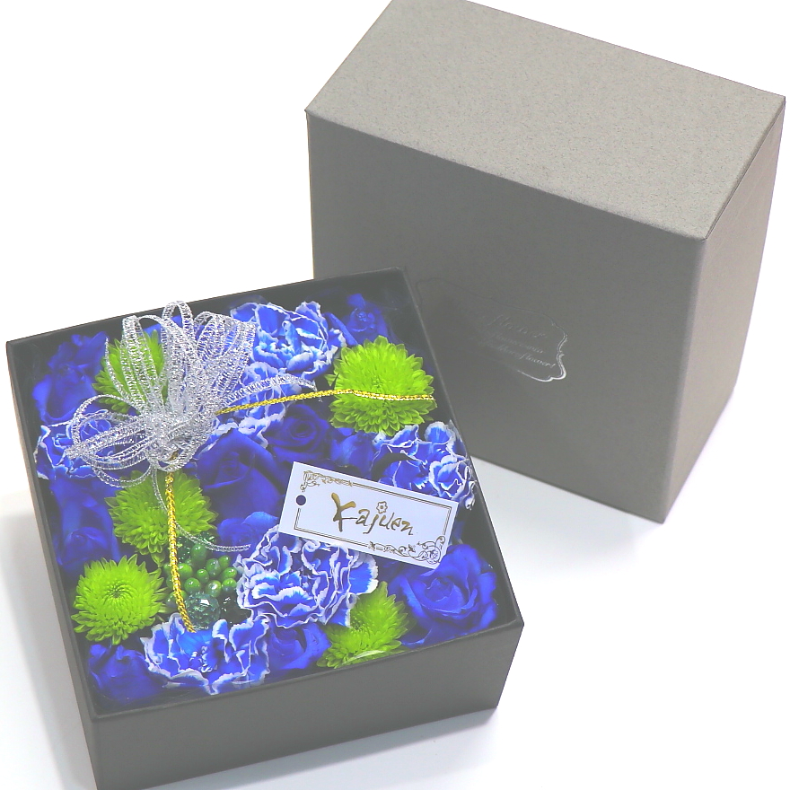 ブルー系のバラを入れた神秘的なボックスフラワーです。いつもとは違ったサプライズ的な贈り物におすすめです。花ももちろん素敵ですが、ボックスも高級感があって素敵なんです。また、持ちの良いお花を中心に使っておりますので花持ちも良いでしょう。ご購入されたお客様から高い評価を頂いております。静岡県長泉町から日本全国【真心】込めてお届けいたします。さまざまなご用途に贈る贈り物としてオススメです。大切な方へ贈るフラワーギフトやプレゼントなら「花樹園オンラインドットコム」に是非、お任せ下さいませ。