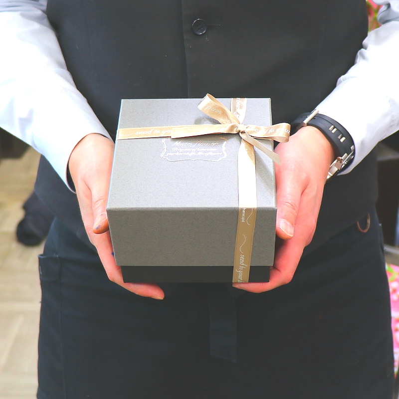 資材・ラッピング: 高級スクエアボックス、モニメントピック、リボン、高級バック付き、吸水性スポンジ、フラワーケアカード(取扱説明書)