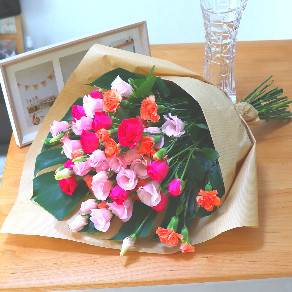 ご自宅のお部屋を明るくしたい方にオススメの切り花をまとめた花束(花瓶別売り)。簡易包装でお届けします。