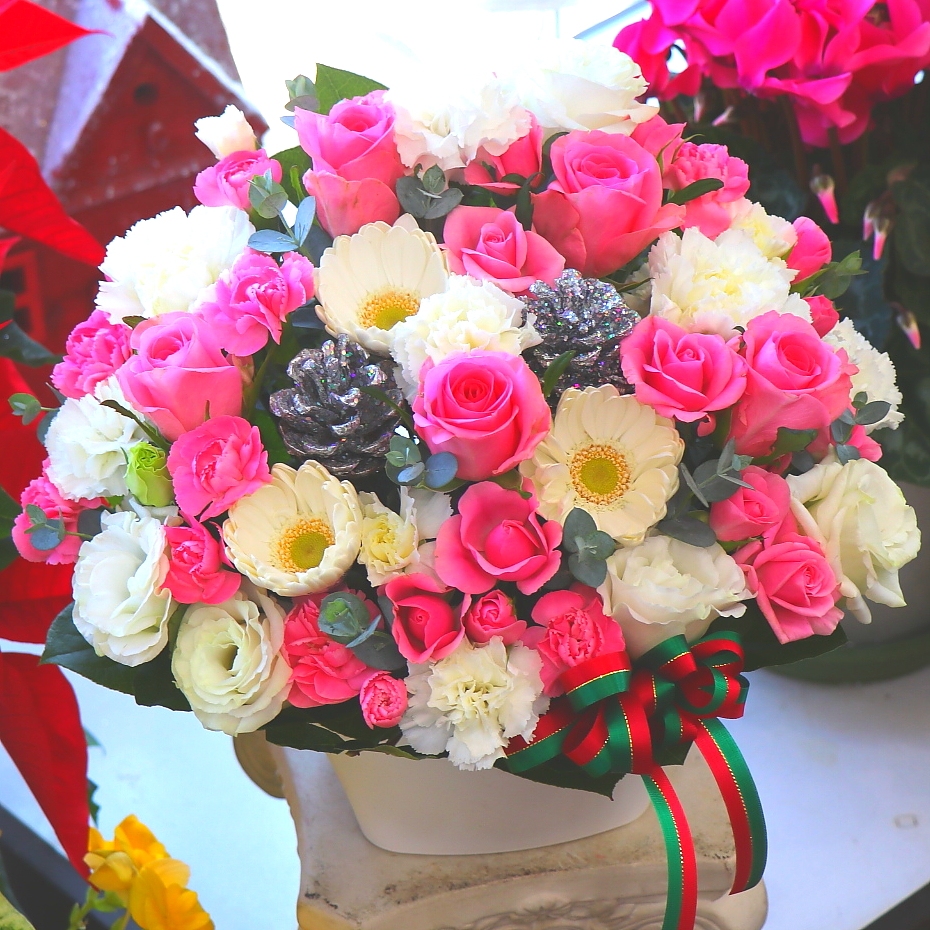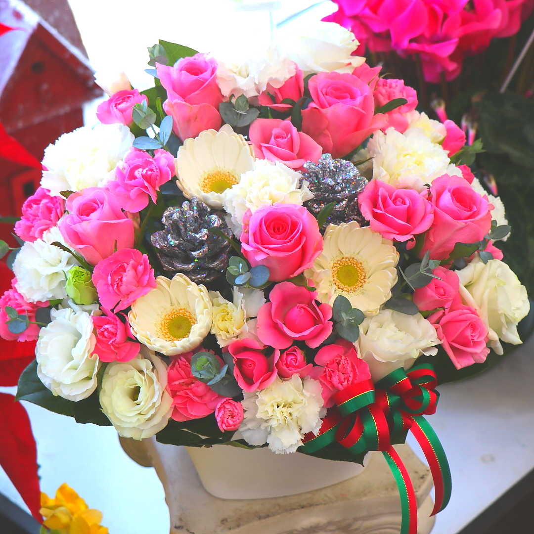 クリスマスの雰囲気がとっても素敵なピンク&ホワイト系のアレンジメント。キラキラの松笠がアクセントでとっても綺麗ですよ!この時期のさまざまなご用途にオススメです!【15時迄のご注文で翌日届きます】※こちらの商品についてのご相談、ご質問等ございましたら(メール)または(お電話)にて承ります。