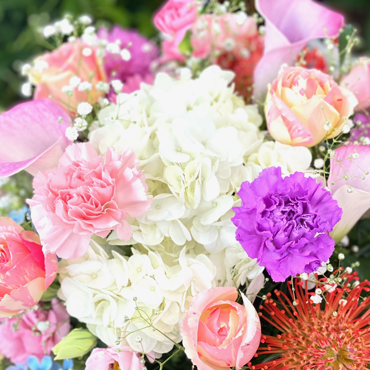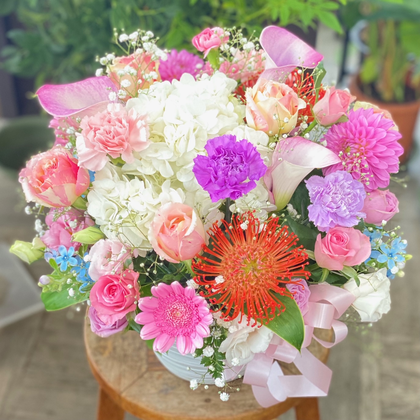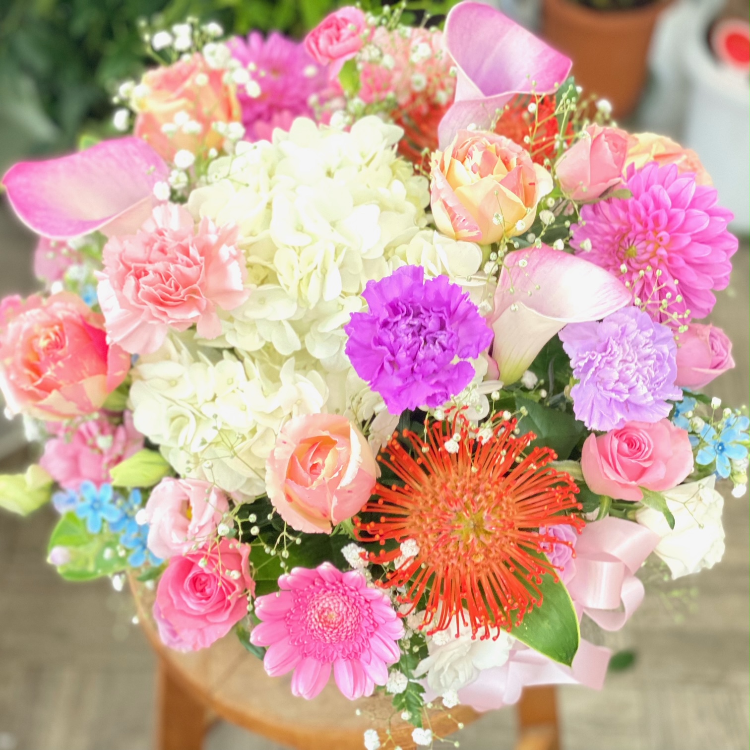 花材: メイン カラー、バラ、ガーベラ、アジサイ、カーネーション、カスミソウなど その他 季節のお花、葉物類など