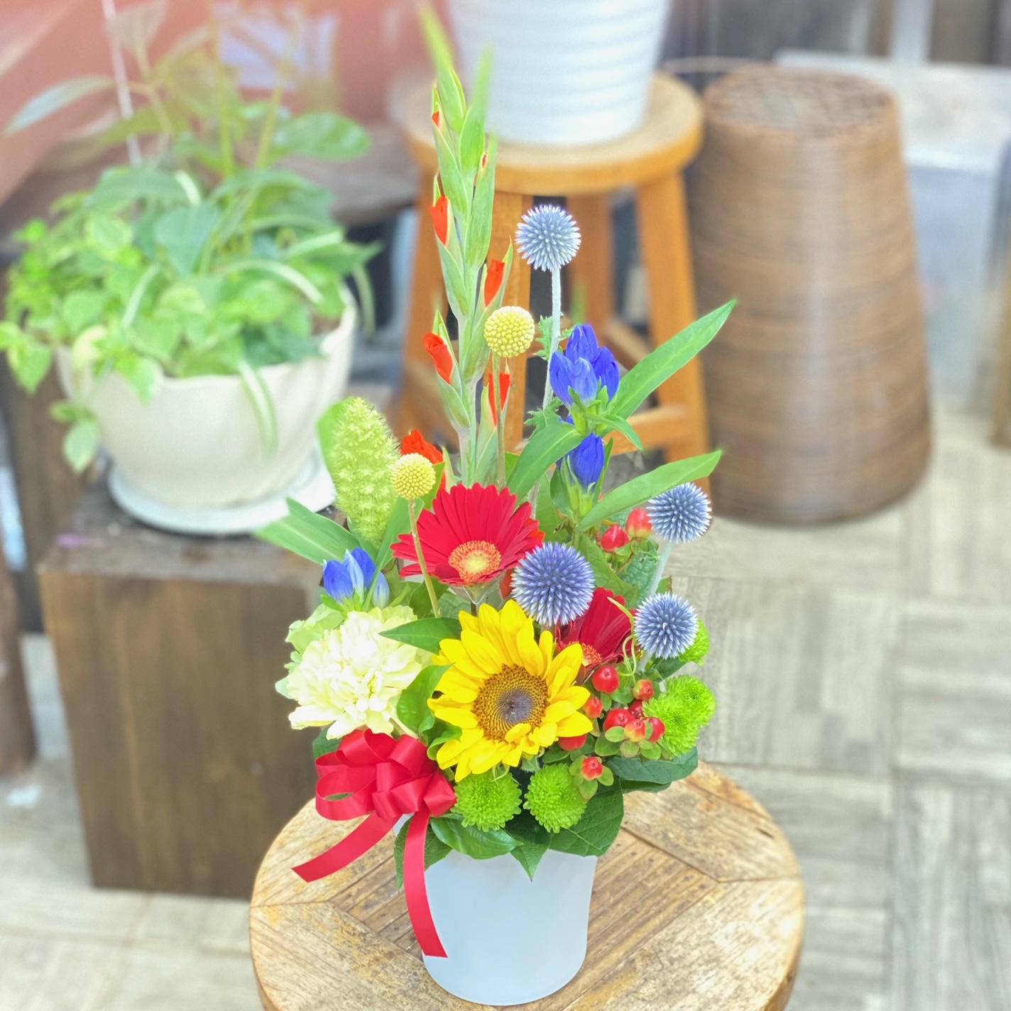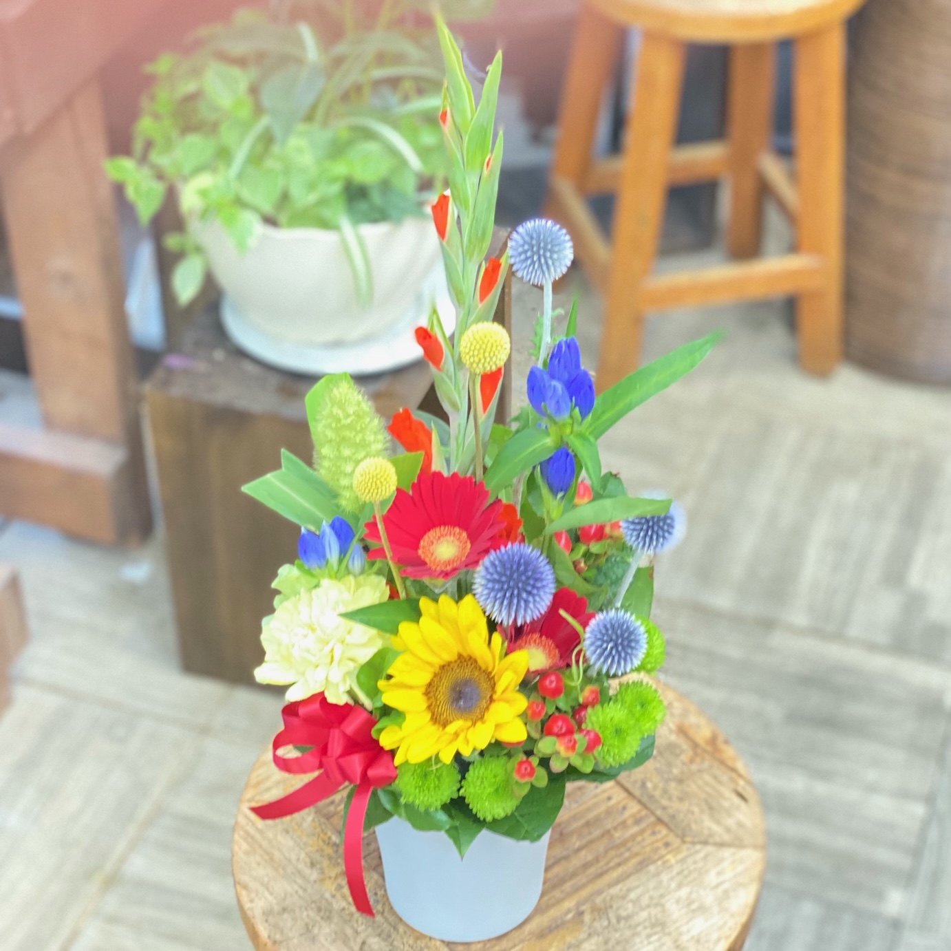 この時期にピッタリなひまわりと季節の花材でまとめたアレンジメント。さまざまな贈り物におすすめです。【15時迄のご注文で翌日届きます】※こちらの商品についてのご相談、ご質問等ございましたら(メール)または(お電話)にて承ります。