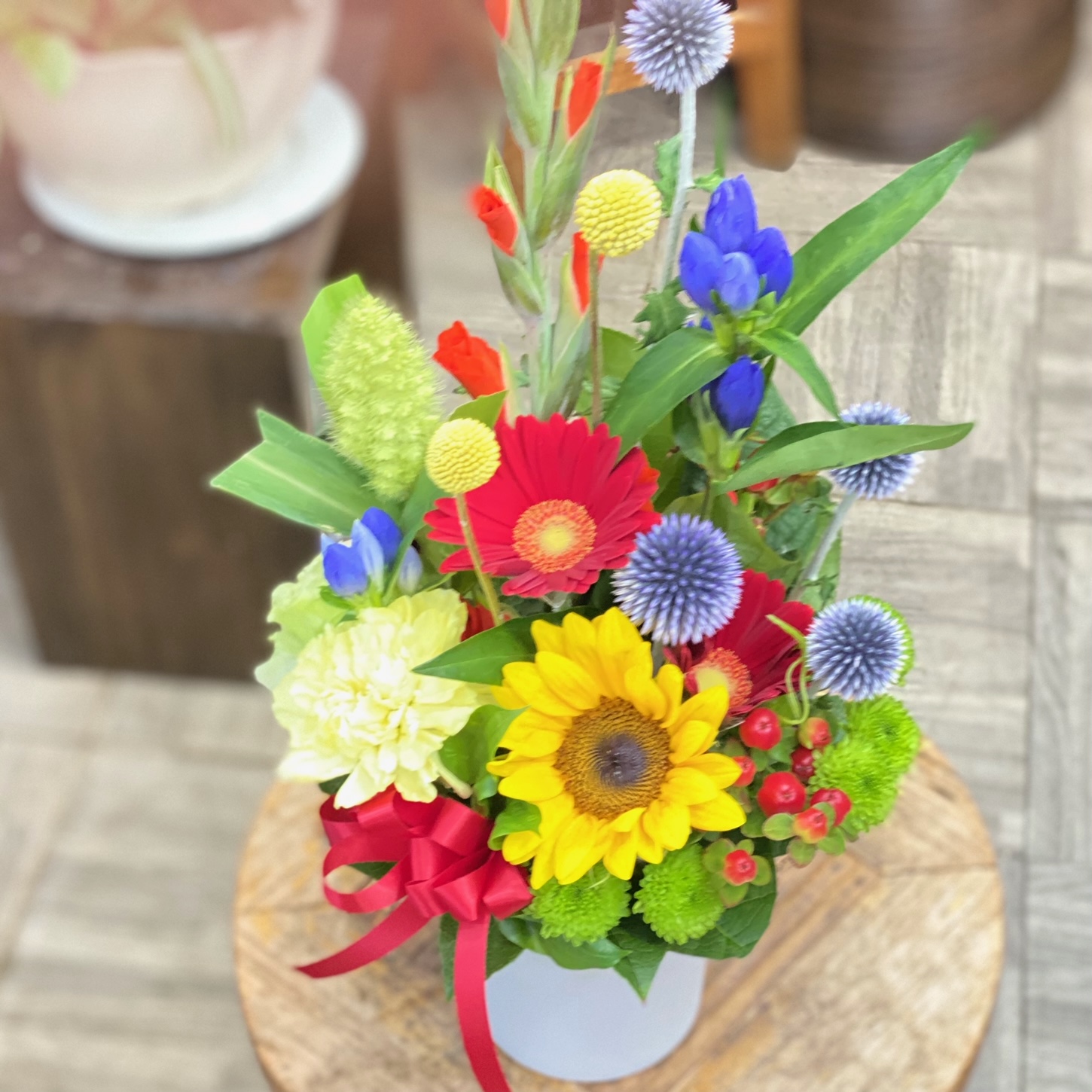 花材: メイン ひまわり、リンドウ、カーネーション、季節の小花、実物類、葉物類など その他 贈答用に綺麗にラッピング致します。