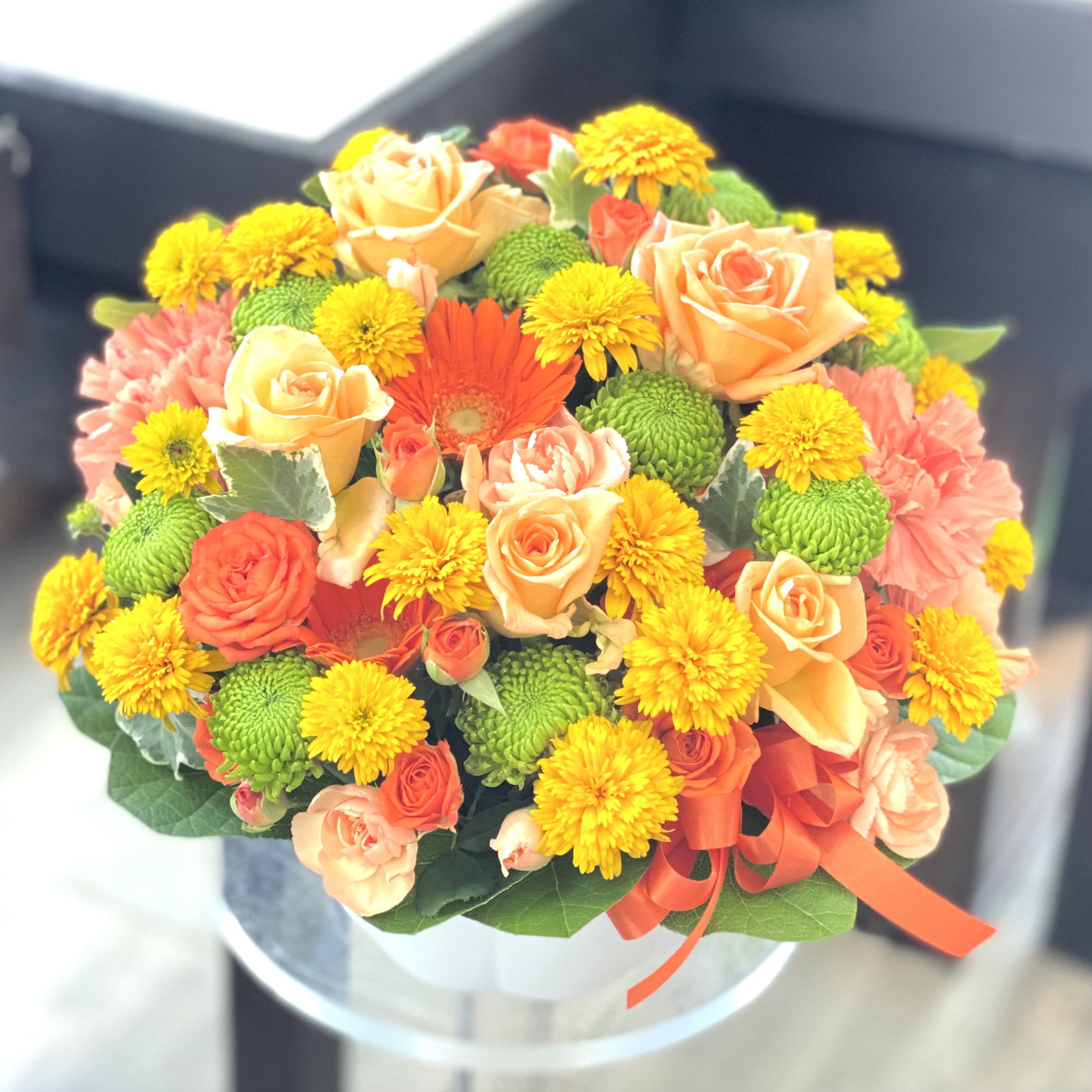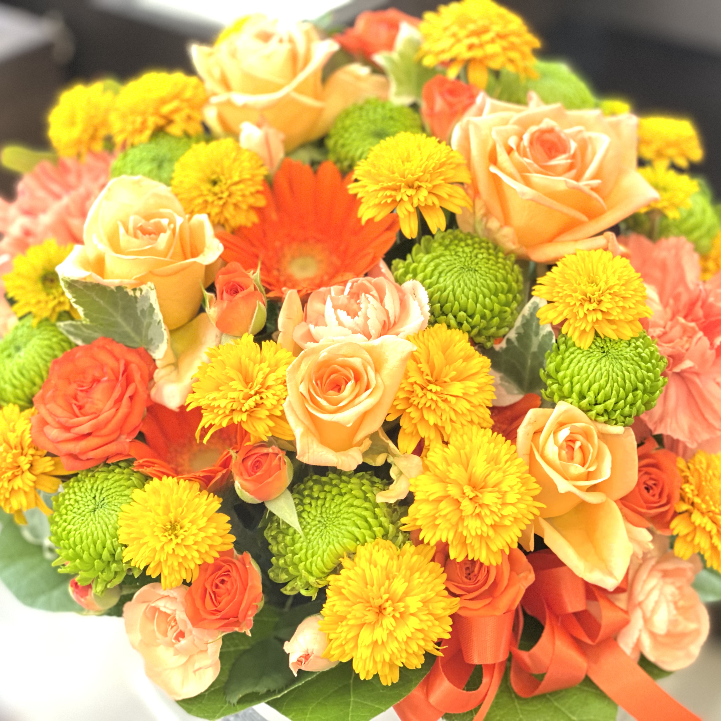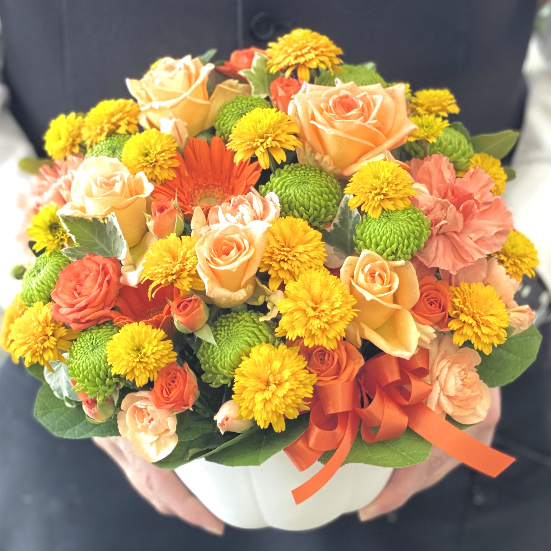 秋色のオレンジ色のお花たちを「ギュ!」とアレンジしたアレンジメント。秋のさまざまな贈り物にオススメです。【15時迄のご注文で翌日届きます】※こちらの商品についてのご相談、ご質問等ございましたら(メール)または(お電話)にて承ります。