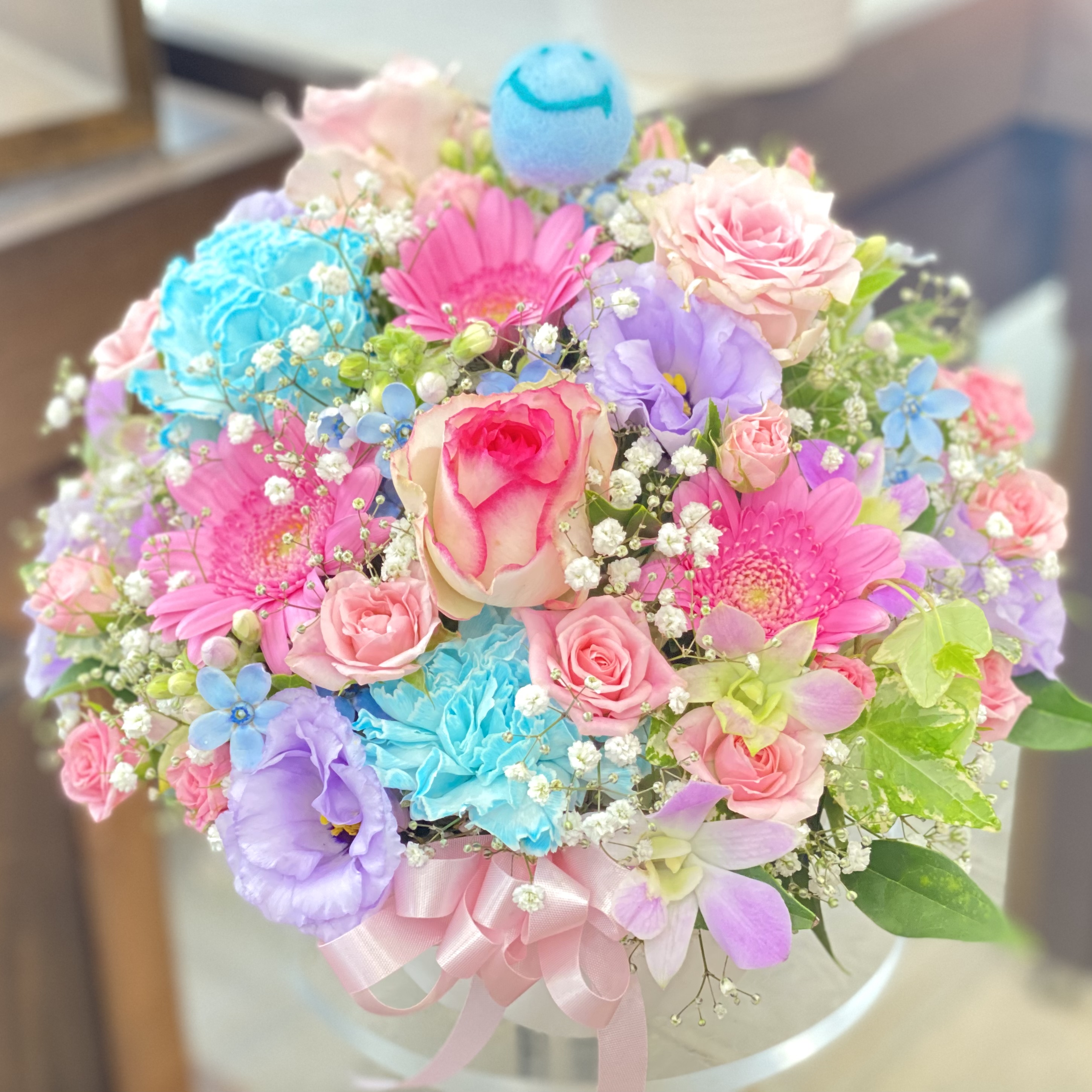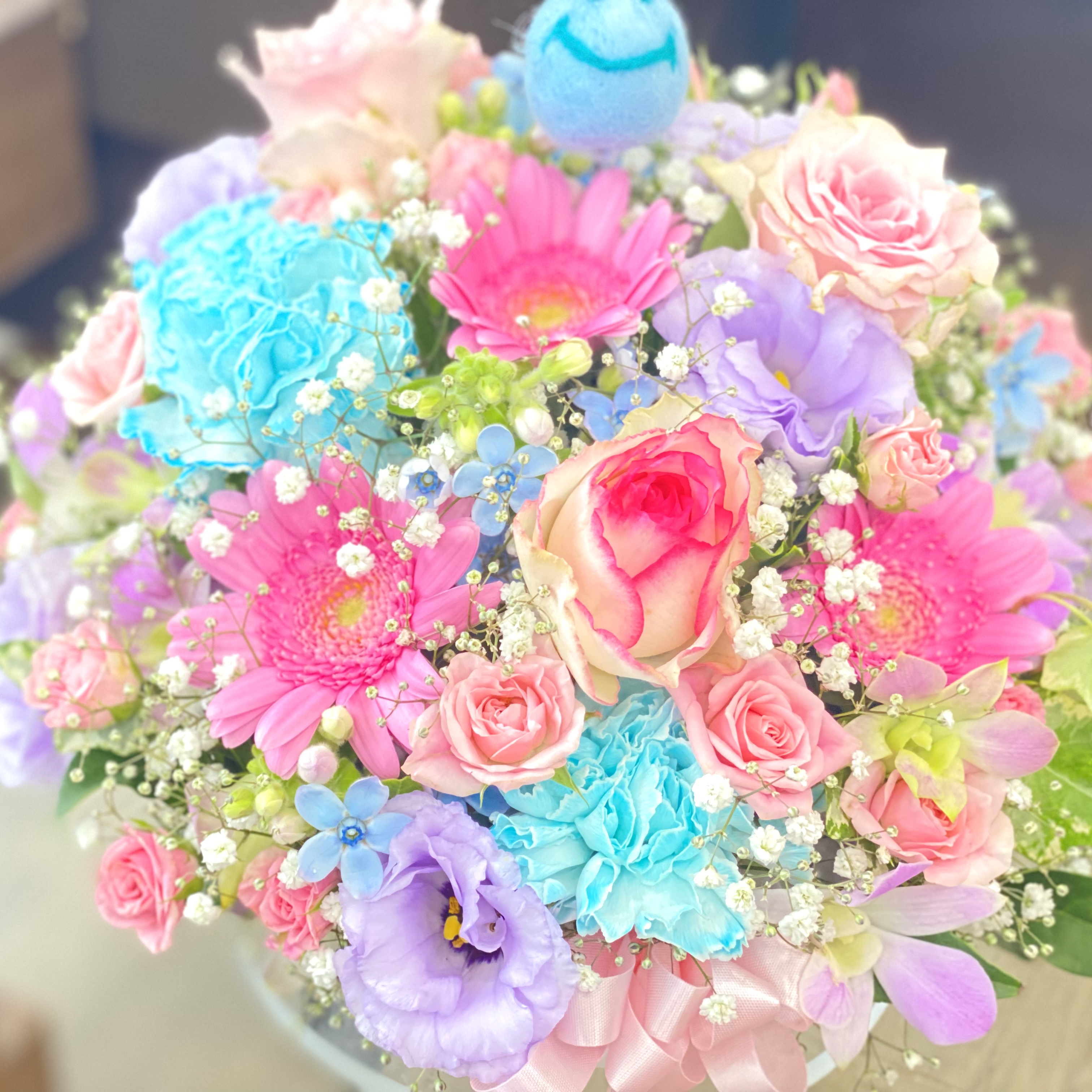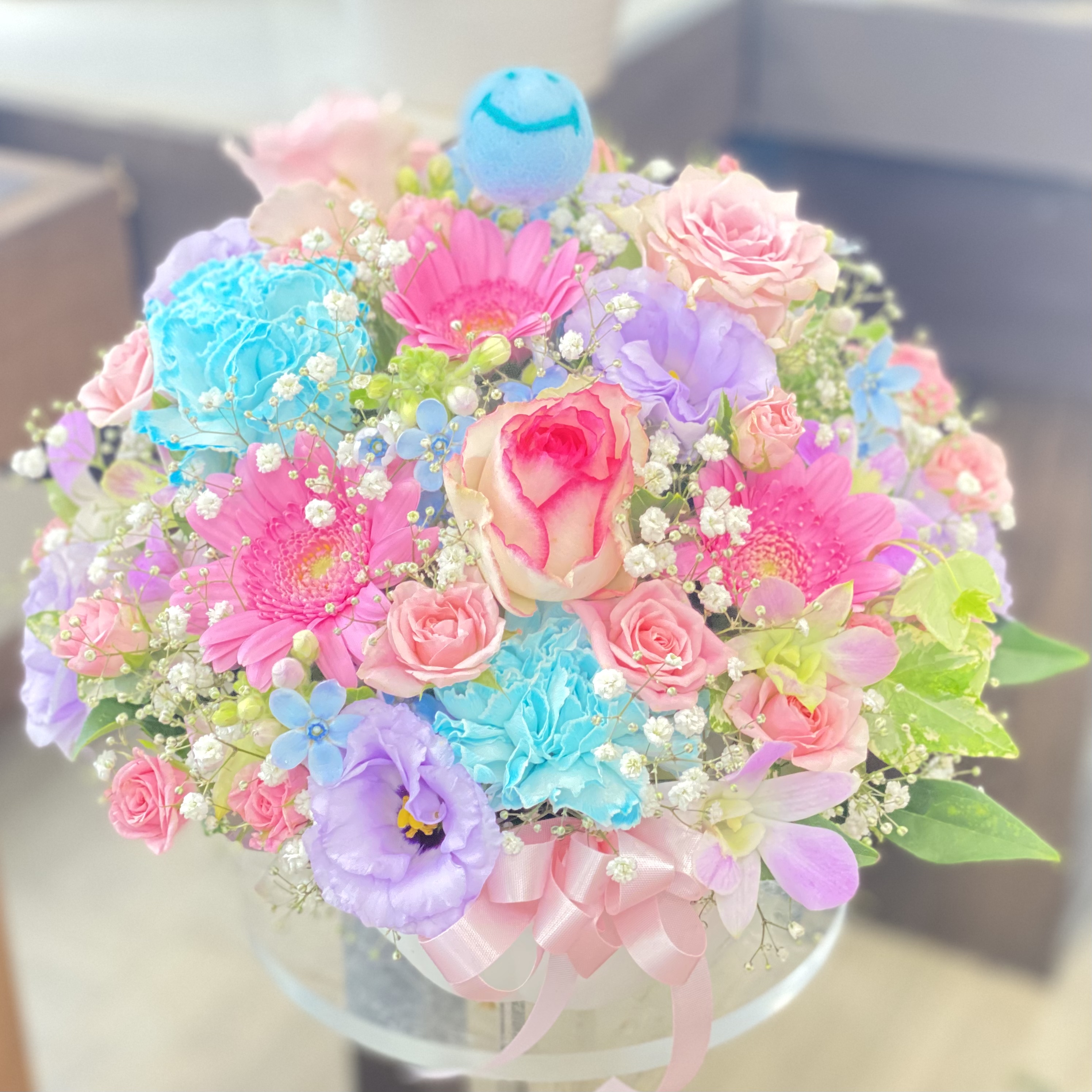 サムシングブルーにちなんだ青いスマイリーピックと淡いピンク&ブルー系のお花でまとめたアレンジメント。さまざまな贈り物にオススメです。【15時迄のご注文で翌日届きます】※こちらの商品についてのご相談、ご質問等ございましたら(メール)または(お電話)にて承ります。