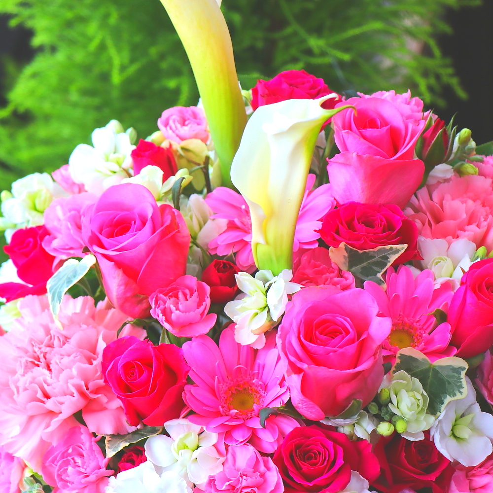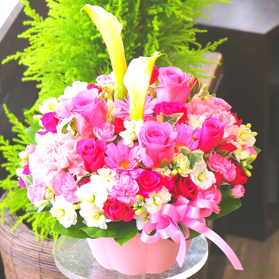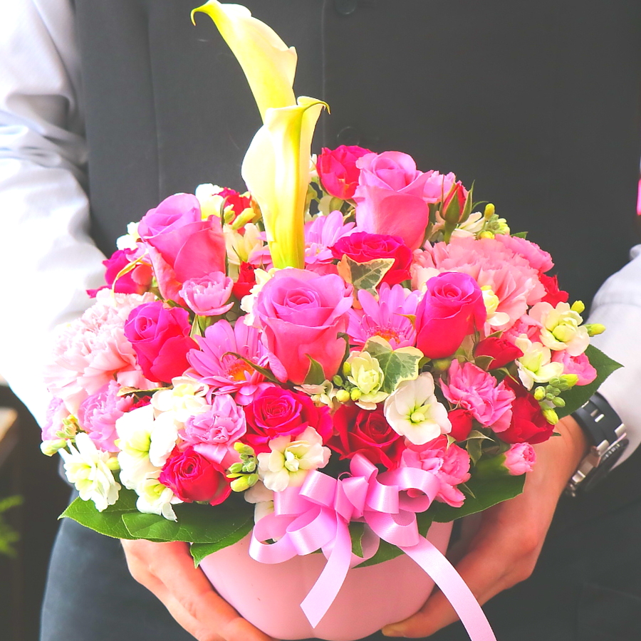 ピンク&ホワイト系のお花たちが「ギュッ」と詰まったアレンジメントです。華やかさと上品さが大切な日を彩ってくれるオススメアイテムです。また、ご利用されたお客様から「大変花持ちが良い」と好評ですよ。あなたの大切な人へ…心を込めてこのアレンジを贈ってみてはいかがですか。さまざまなご用途にお使いいただけますよ。
