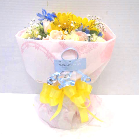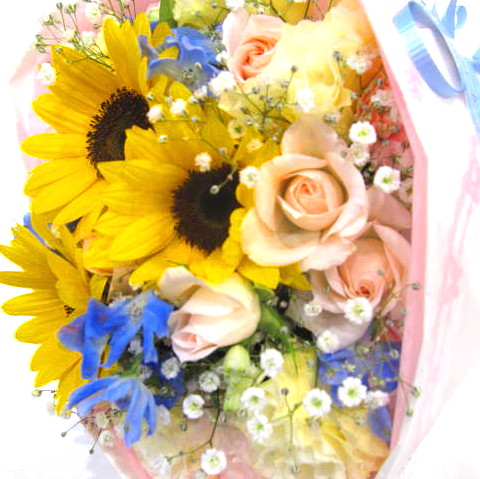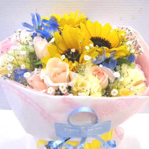 花材: メイン ヒマワリ、ミニバラ、ミニカーネーションなど その他 かすみ草、葉物類など