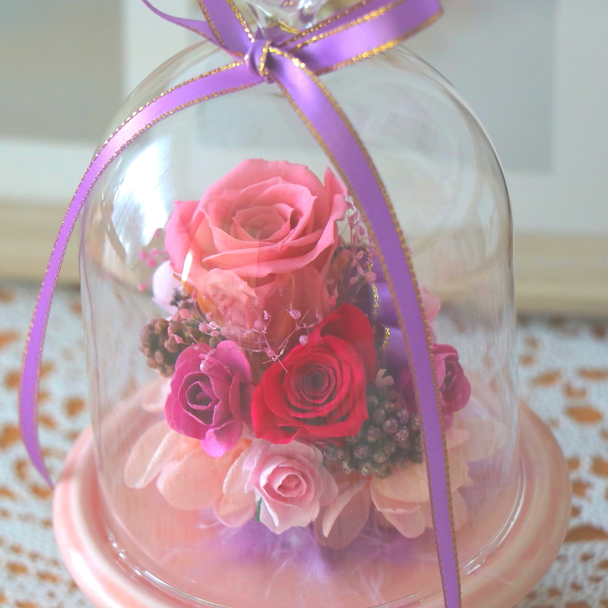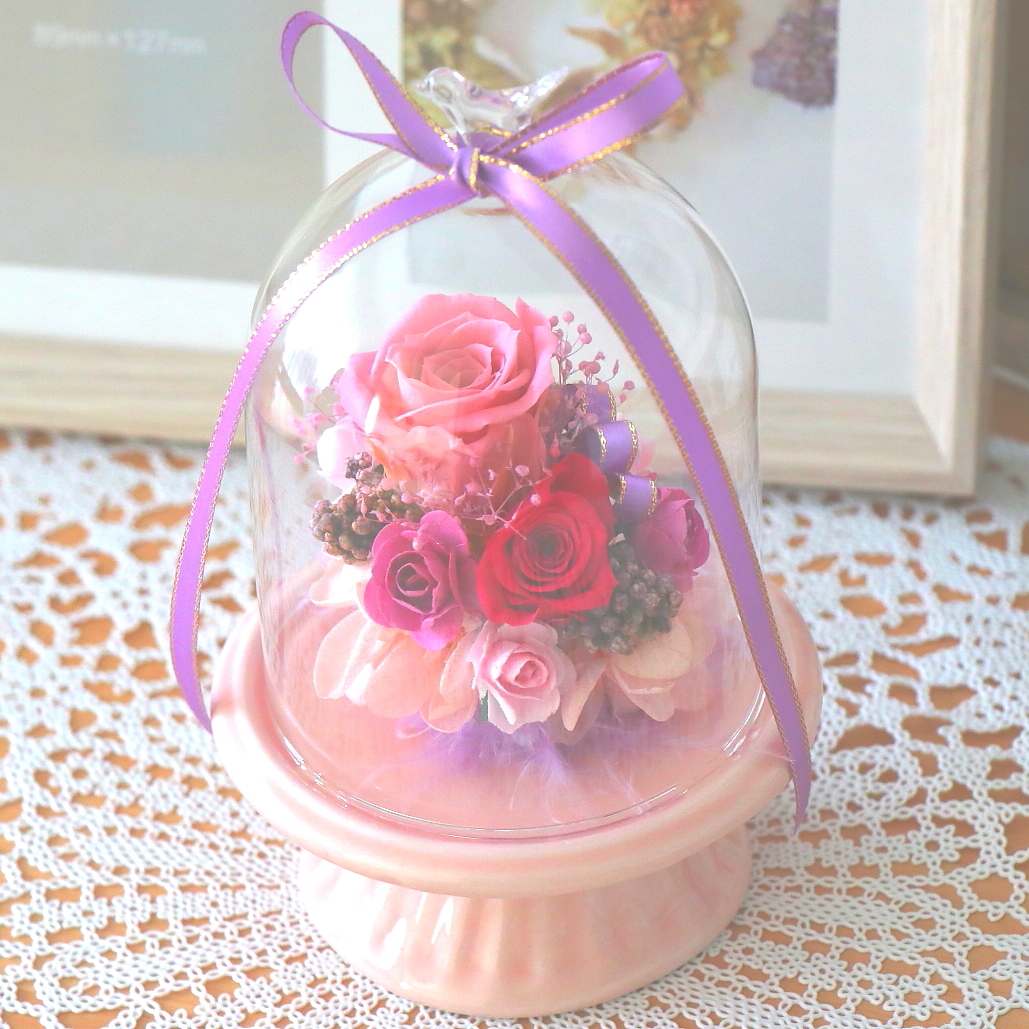 ピンク&パープル系のプリザーブドフラワーを鳥かごのようなガラスドームにアレンジしたプリザーブドフラワーです。カラーバリエーションは6色!贈る方のイメージに合わせて贈るのも良し!自分好みで贈るのも良し!ご自宅用に飾ってもオシャレで明るくお部屋を彩ってくれます。是非、想いを込めたフラワーギフトにいかがですか!?