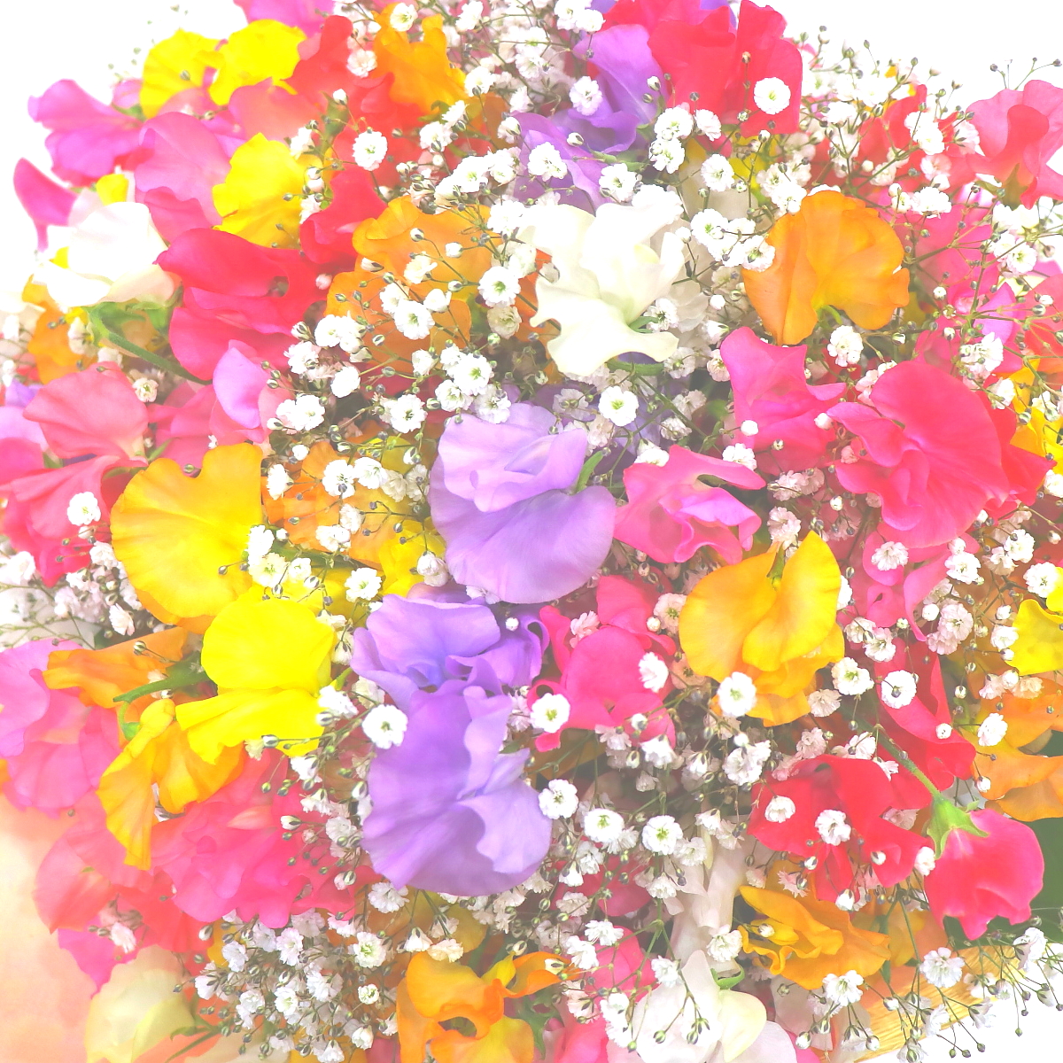 スイートピーをカラフルにミックスし、かすみ草を入れたとても華やかな花束です。季節を感じ、きっと心に残る特別な贈り物になると思います。また、ご利用されたお客様から「大変花持ちが良い」と好評をいただいております。静岡県長泉町から日本全国【真心】込めてお届けいたします。ちょっといつもと変えたいと思う方の贈り物としてオススメです。大切な方へ贈るフラワーギフトやプレゼントなら「花樹園オンラインドットコム」に是非、お任せ下さいませ。