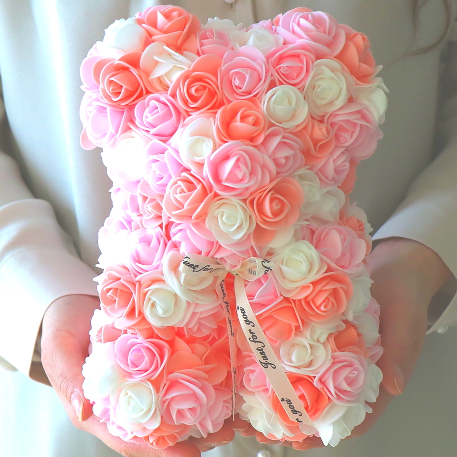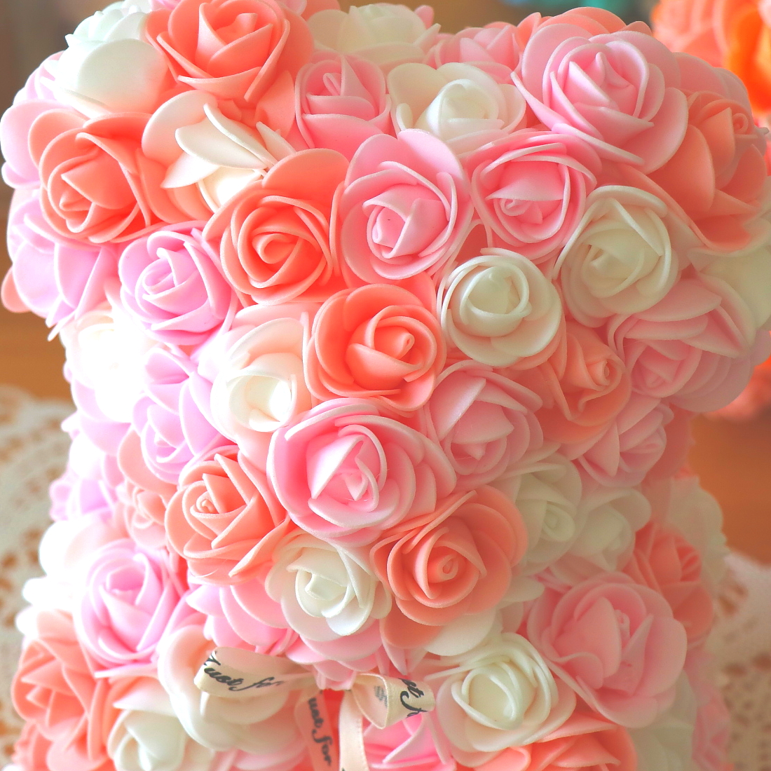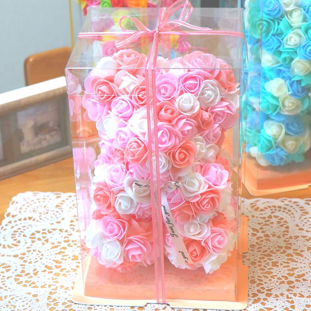 ポリエステル製の造花のバラのみで作ったクマさんに見立てたアレンジメントです。女性への贈り物にいかがですか。ピンクの上品な色合いにきっと喜んでいただけると思いますよ!しかもクリアケース付きなのでお部屋のインテリアとしてもお洒落に飾れるので貰って嬉しい贈り物ですよ。当店ではお客様の想い大切に【こころを込めて】お作りいたします。静岡県駿東郡長泉町から日本全国へお届けします。是非、想いを込めたフラワーギフトにいかがですか!?