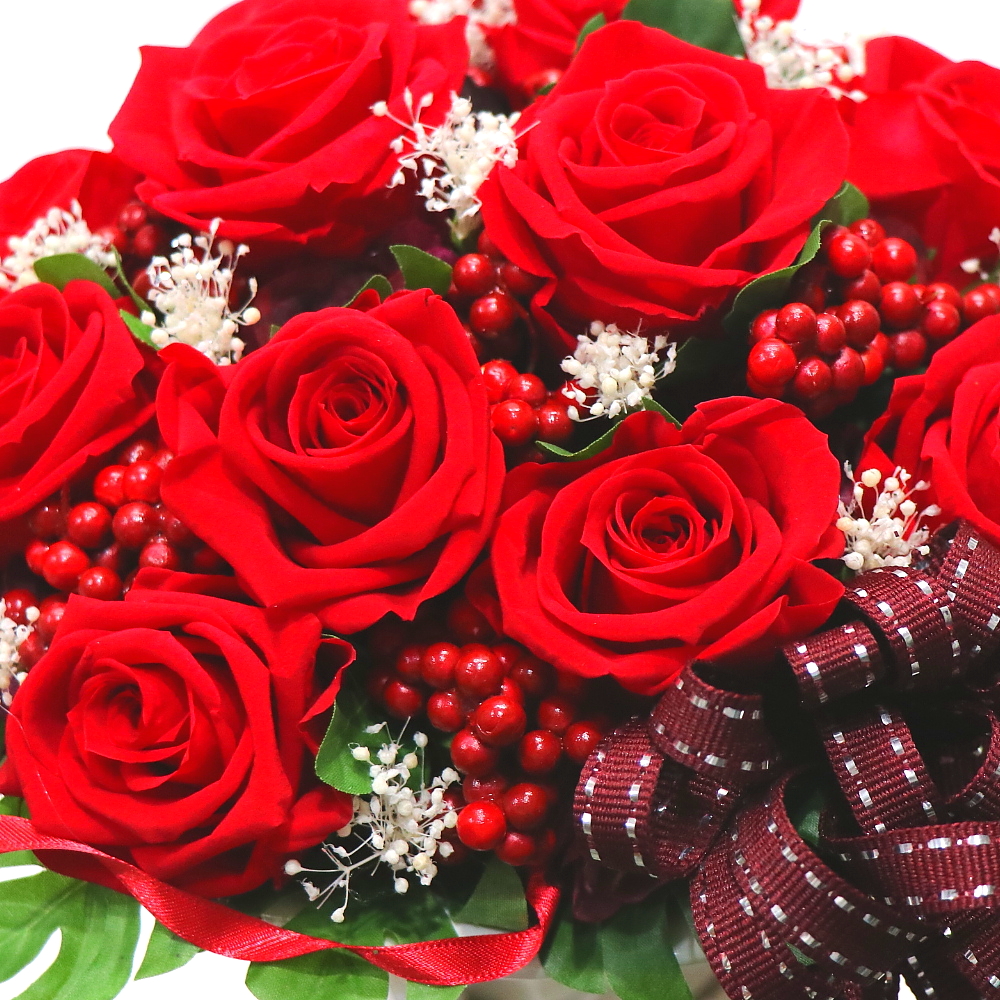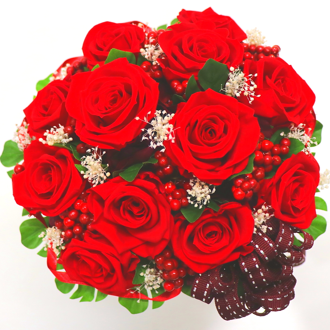 真っ赤なプリザーブドローズを入れた赤系のプリザーブドフラワー。大切な方への特別な贈り物に想いがしっかり伝わります。※こちらの商品についてのご相談、ご質問等ございましたら(メール)または(お電話)にて承ります。