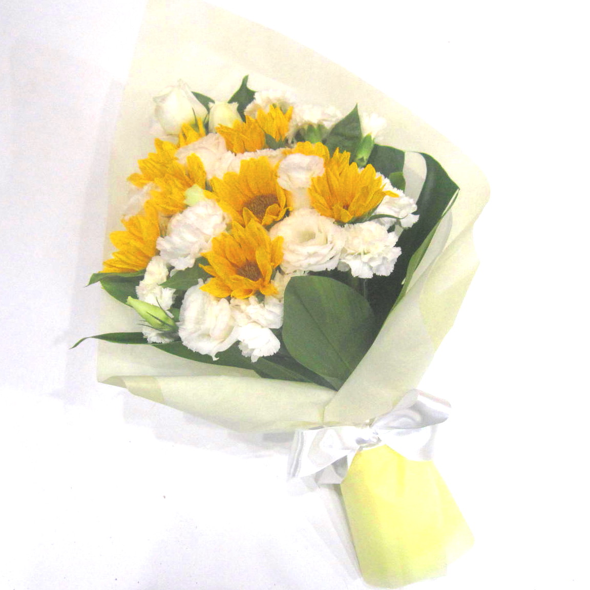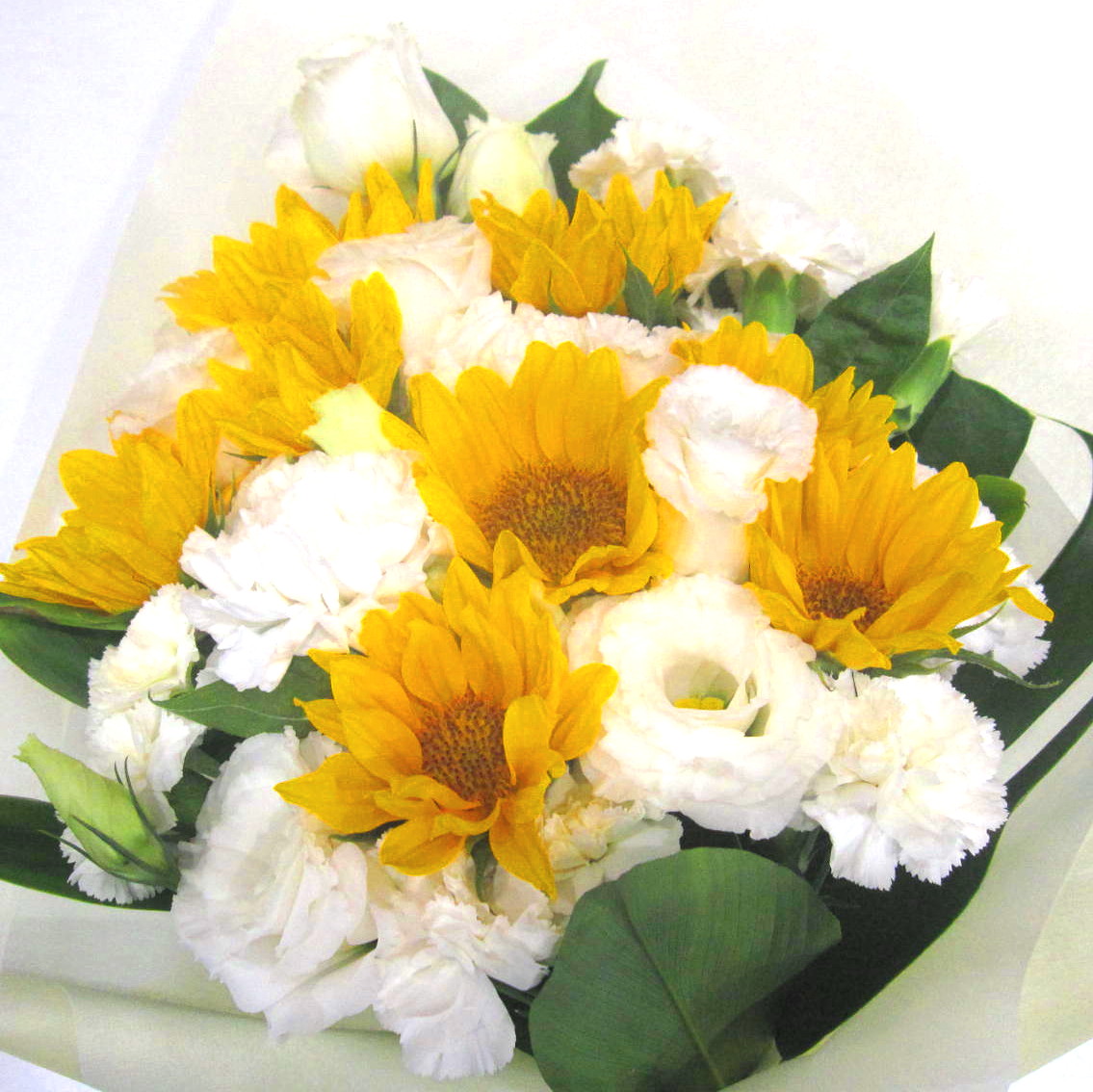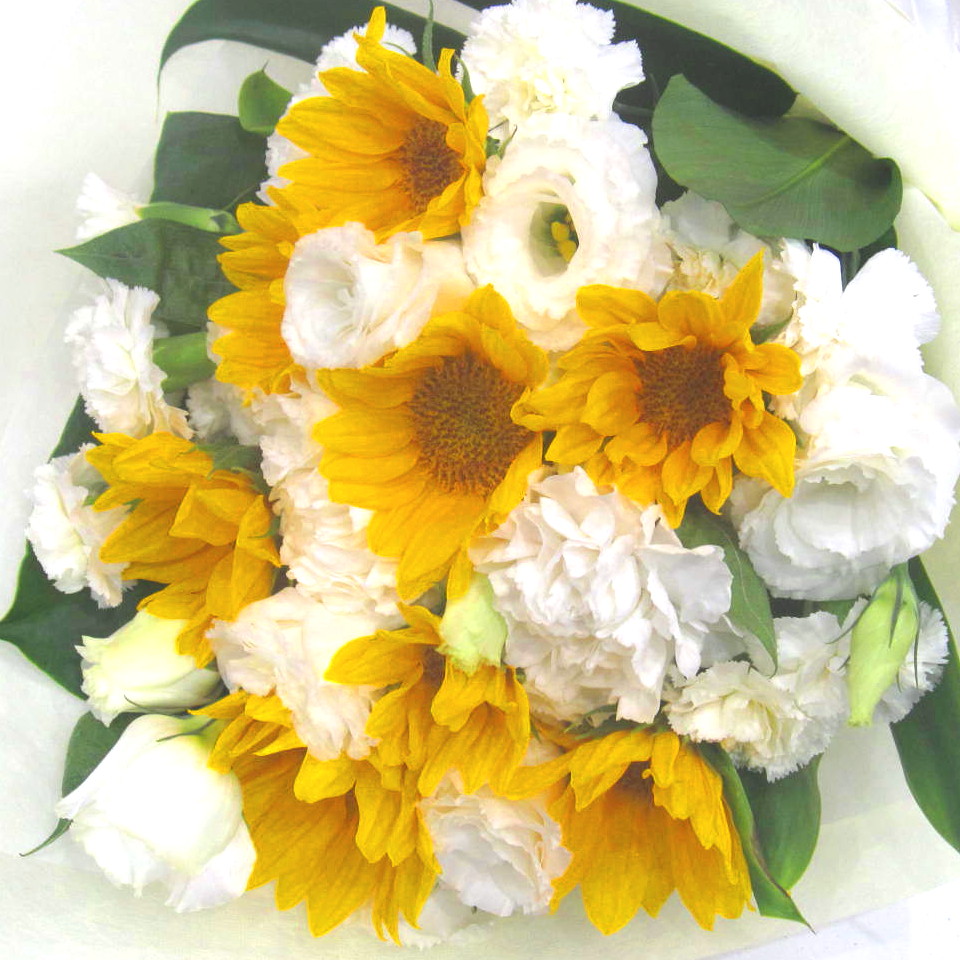 ひまわりを中心とした白系でまとめたお供え・お悔やみ花束。ご遺族の気持ちを優しくいたわって故人を偲びます。【15時迄のご注文で翌日届きます】※こちらの商品についてのご相談、ご質問等ございましたら(メール)または(お電話)にて承ります。