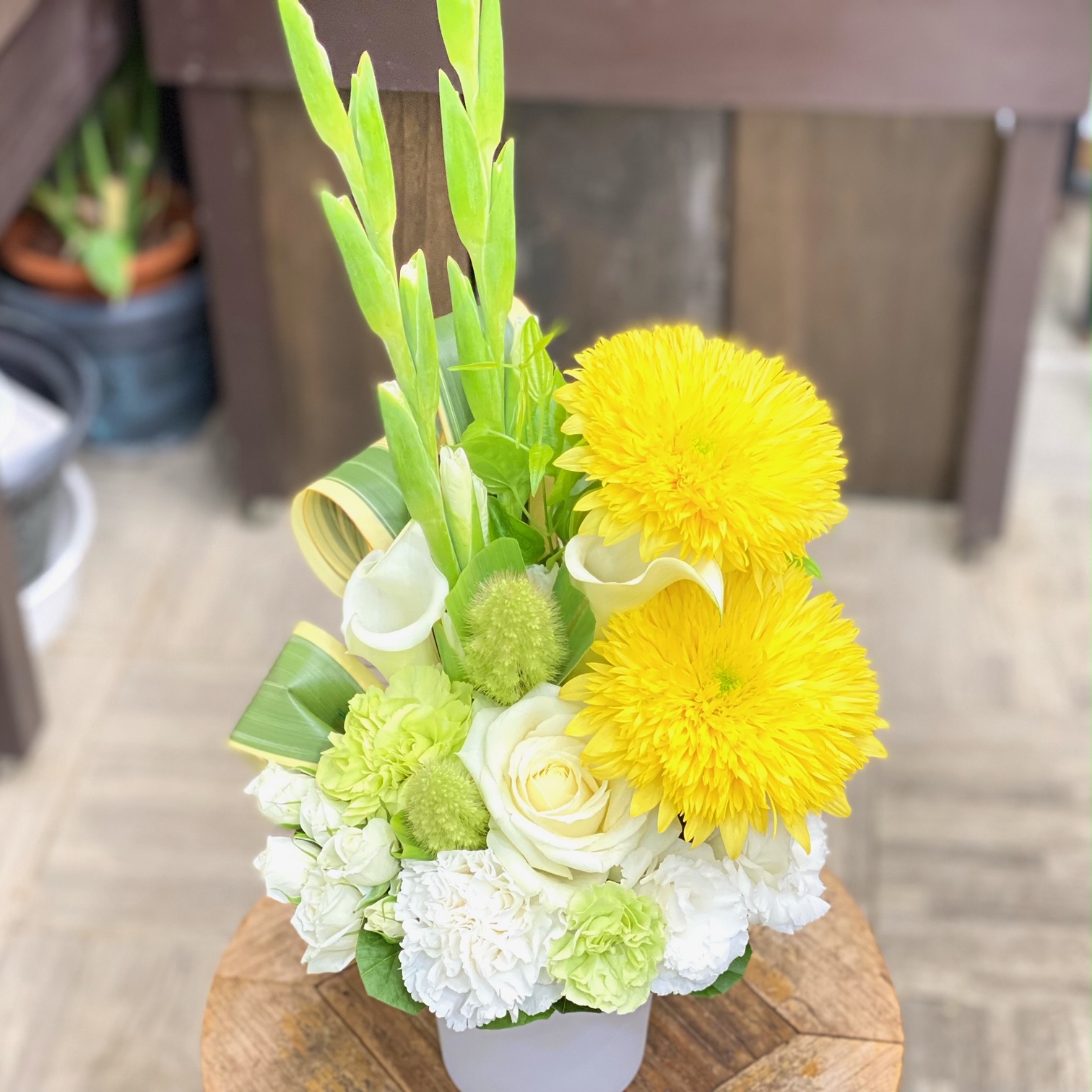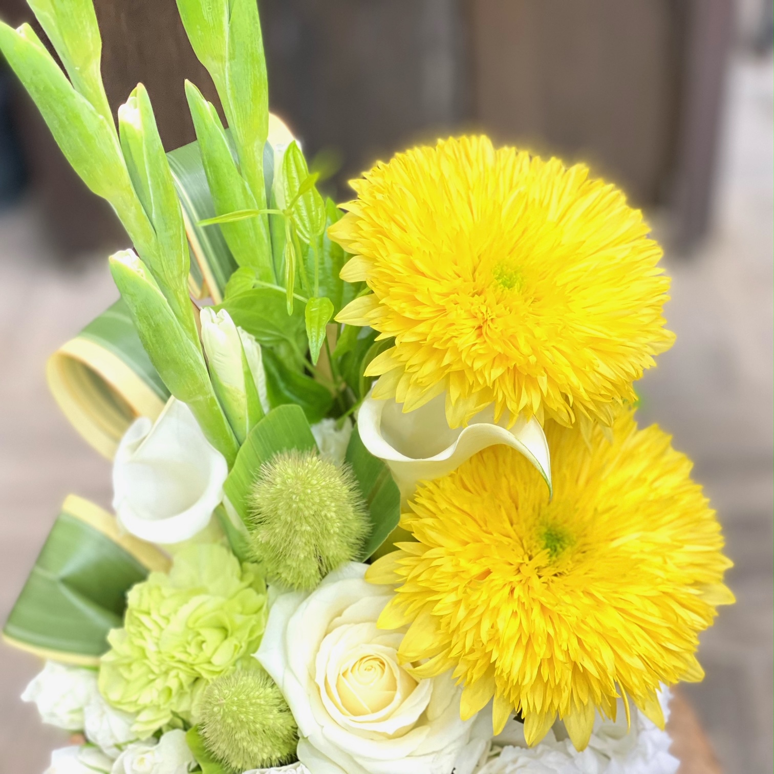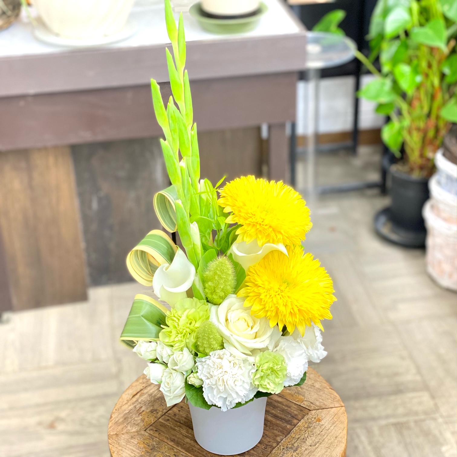 ヒマワリを中心としたお供え・お悔やみアレンジメントです。スタイリッシュにデザインして制作させていただきます。。目を閉じて心の中にいる故人への想いをそっと呼び起こします。故人への供養はもちろん、ご家族やご遺族様の心を癒すことでしょう。当店では、お客様のその想いをしっかりと受け止め、心を込めて制作致します。故人を偲ぶ色々なシーンで是非、ご利用下さい。