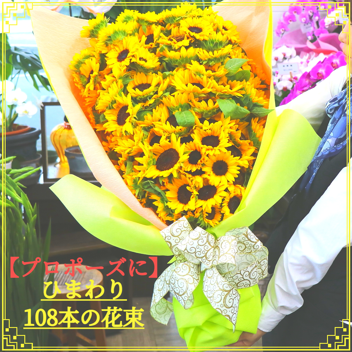 国産のひまわりだけを108本束ねたプロポーズにふさわしい花束です。両手に抱える大きさで重量感もあり、一生に一度の晴れ舞台を立派に彩ってくれます。婚約者多数!!静岡県長泉町から日本全国【真心】込めてお届けいたします。是非、プロポーズにいかがでしょうか。大切な方へ贈るフラワーギフトやプレゼントなら「花樹園オンラインドットコム」に是非、お任せ下さいませ。