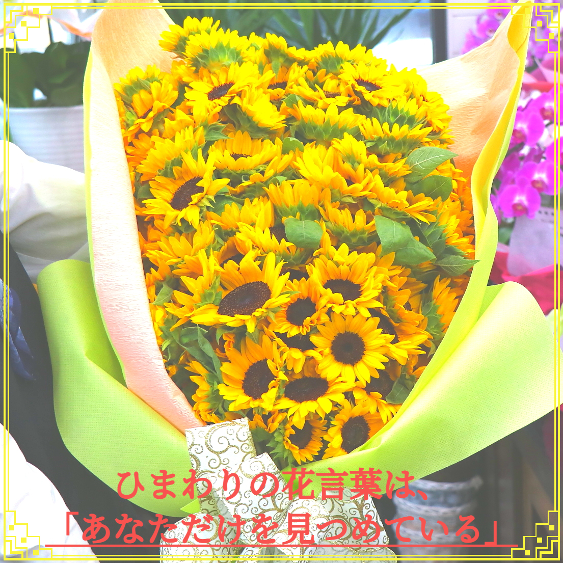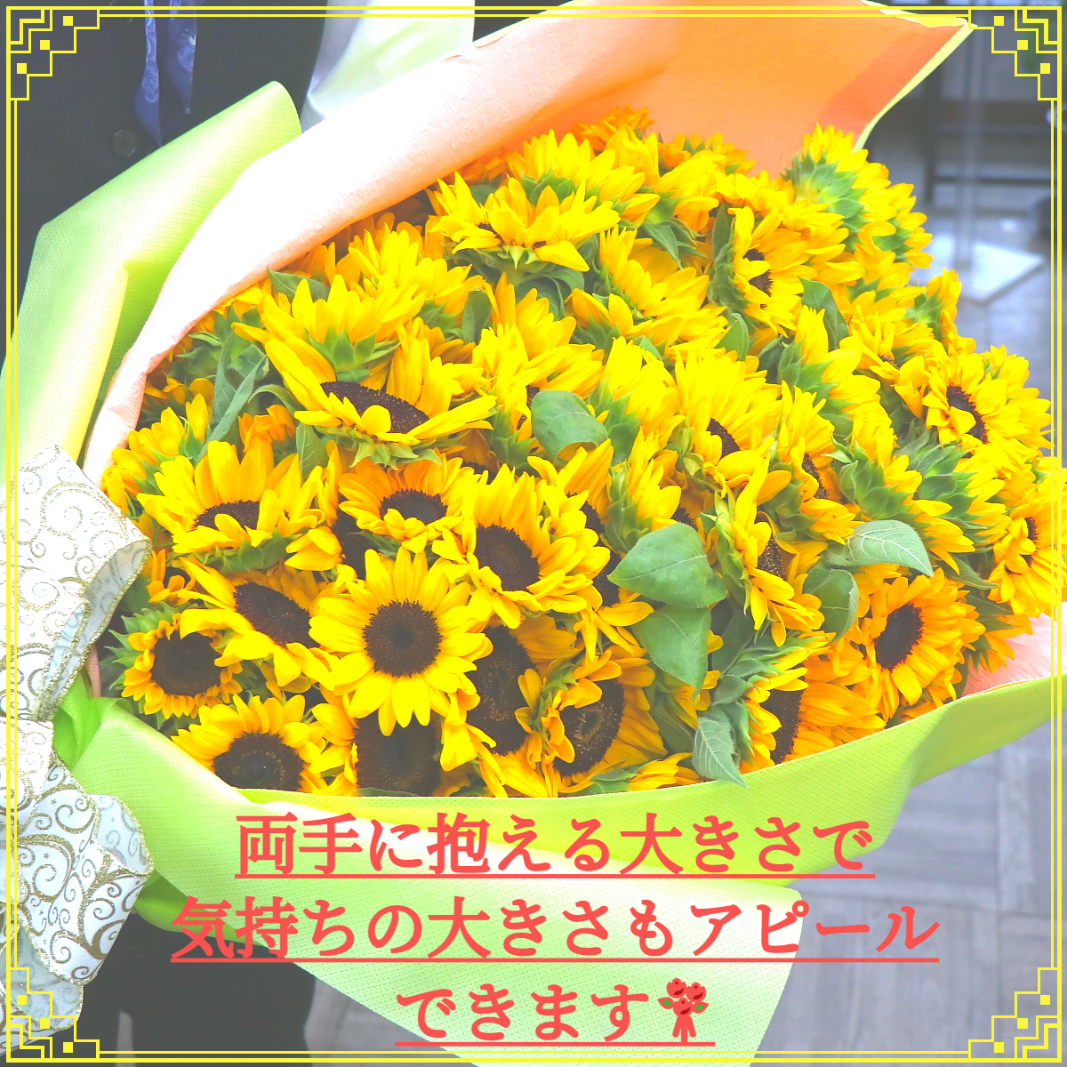 「永遠(とわ)=108」という語呂にあわせた意味で、お花のギフトでプロポーズに男性から女性に渡す本数は108本が縁起が良いとされています。ひまわりのみで特別な瞬間を彩りませんか。また、ご希望の本数やお届け日時等ありましたらご相談下さい。