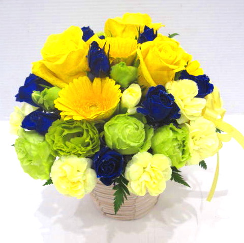 【黄色いバラ】をバランス良く入れ、アクセントに青いミニバラ(オリジナル染色)を入れた明るく上品なアレンジメントです。スタイルは、オールラウンドで制作。どこから見ても綺麗に見えます。きっととびっきりに喜んでいたただけると思います。当店ではお客様の想い大切に【こころを込めて】お作りいたします。静岡県長泉町から手渡しお届けまたは宅急便で全国にお届けします。是非、さまざまな贈り物に。