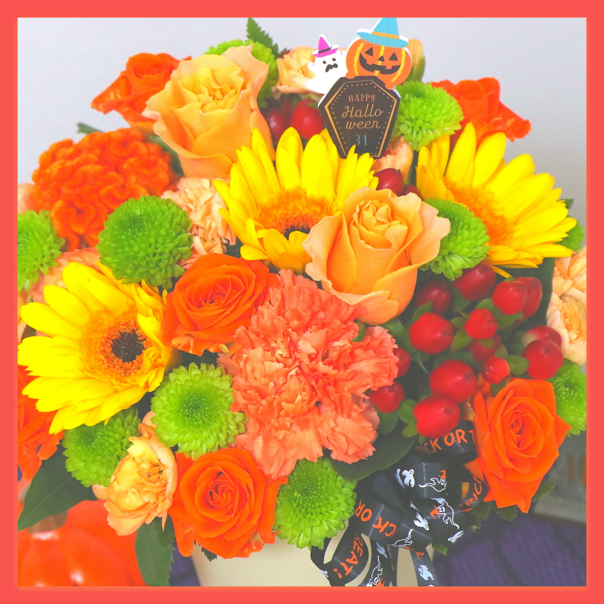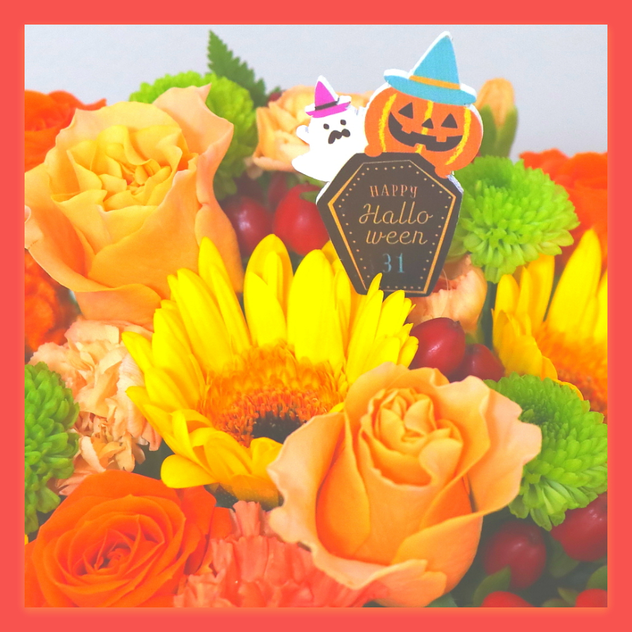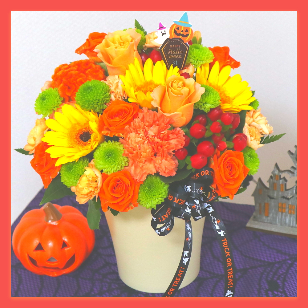 「バラ」や「ガーベラ」、「カーネーション」など存在感のあるお花を入れたこの時期にピッタリなハロウィンアレンジメントです。黄色&オレンジ系の明るい華やかな雰囲気でハロウィンピックを入れて制作致します。もちろん厳選した花材を使用しておりますので、ご利用されたお客様から「大変花持ちが良い」と好評ですよ。あなたの大切な人へ…心を込めてこのアレンジを贈ってみてはいかがですか。ハロウィンに限らずさまざまなご用途にお使いいただけますよ。
