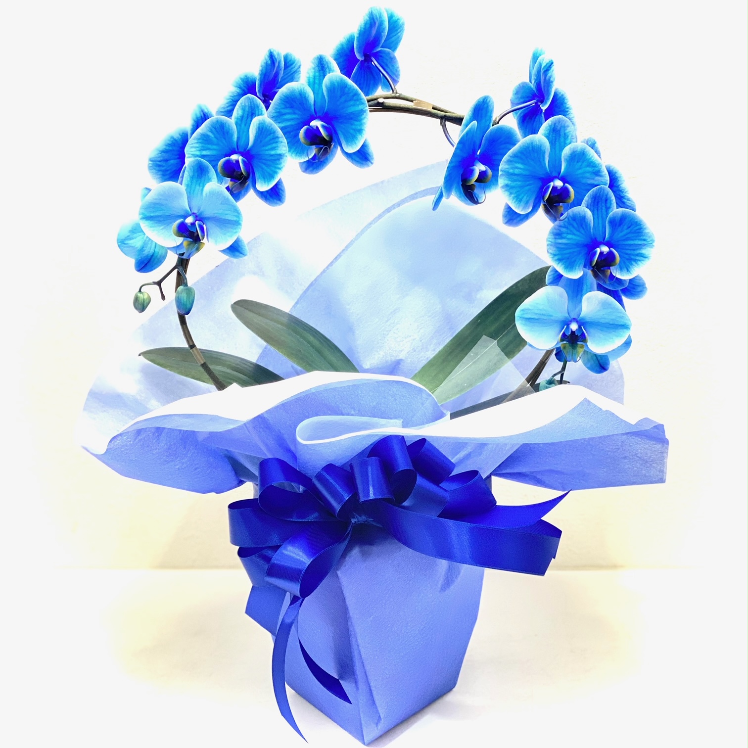 涼しげな雰囲気が漂う小輪系のリングタイプの青色胡蝶蘭《ブルーアマビリスエレガンス》をお供え用にラッピングしました。世界で4カ国しか生産されておらず、日本での生産者は1社のみ。滅多に市場に出回らない【超希少な胡蝶蘭・エレガンスシリーズ】【15時迄のご注文で翌日届きます】【メッセージカードやお名札も(無料)】でお付け致します※こちらの商品についてのご相談、ご質問等ございましたら(メール)または(お電話)にて承ります。