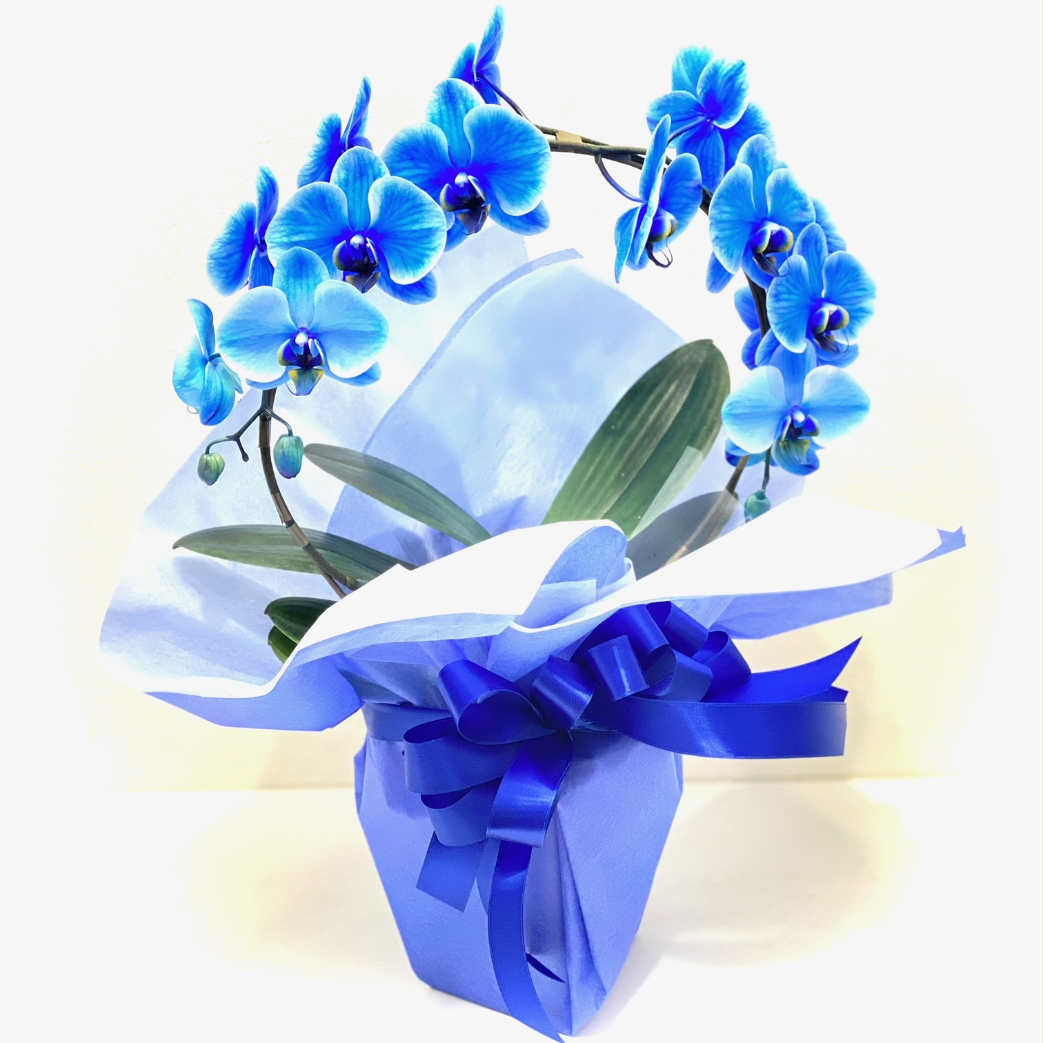 胡蝶蘭エレガンスシリーズは、新たな技術の染色による胡蝶蘭です。お供え用にピッタリな希少なアマビリス系のブルーのリングタイプの胡蝶蘭で滅多に市場では出回りません。輪数はだいたい20輪以上お花が付いており、取扱説明書付きなので頂いた方も安心です。また、大きさもコンパクトでモダンな感じなので置き場所を選ばず、ご仏壇の横のスペースに飾っていただけるとちょうど良いかもしれません。手入れも簡単で花持ちも抜群です。故人を偲ぶさまざまなシーンでお使い頂けます。当店ではお客様の想い大切に【こころを込めて】お作りいたします。後払い決済&クレジット決済可能です。その他、わからないことやご相談等ございましたらお気軽にお問合せ下さい。