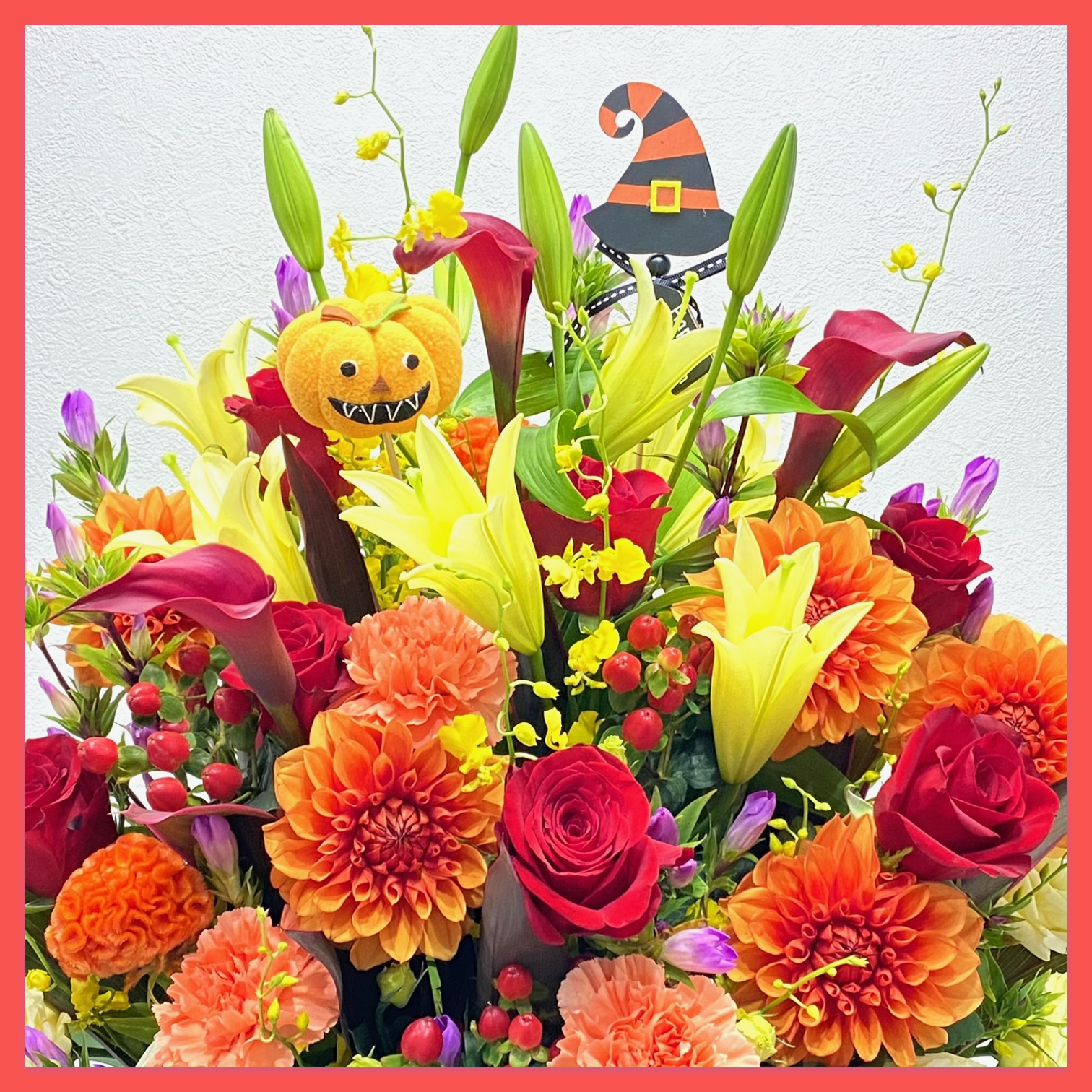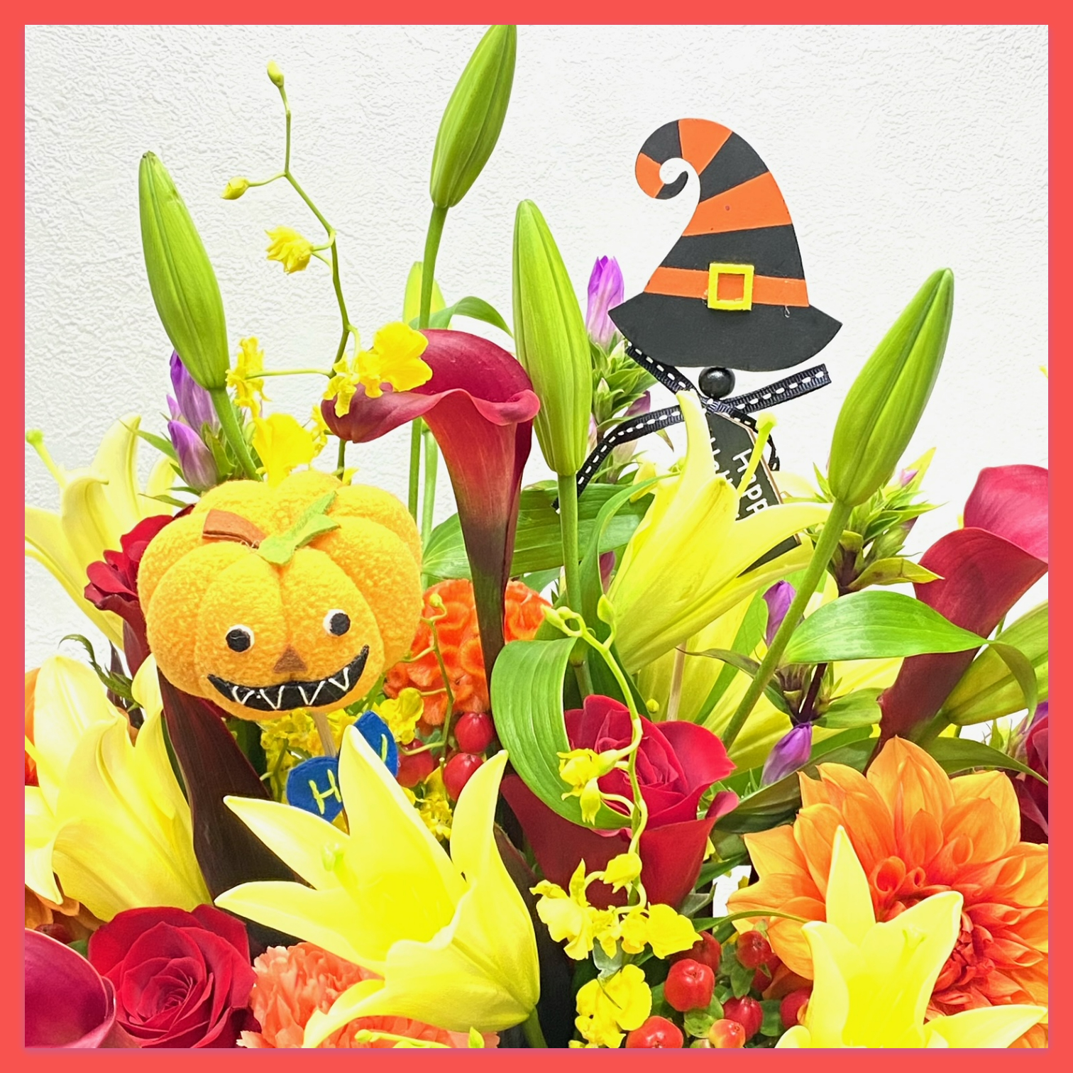 ハロウィンピック付きの豪華なハロウィンアレンジメント。ハロウィンに限らずさまざまなお祝い用途におススメです。【15時迄のご注文で翌日届きます】※こちらの商品についてのご相談、ご質問等ございましたら(メール)または(お電話)にて承ります。