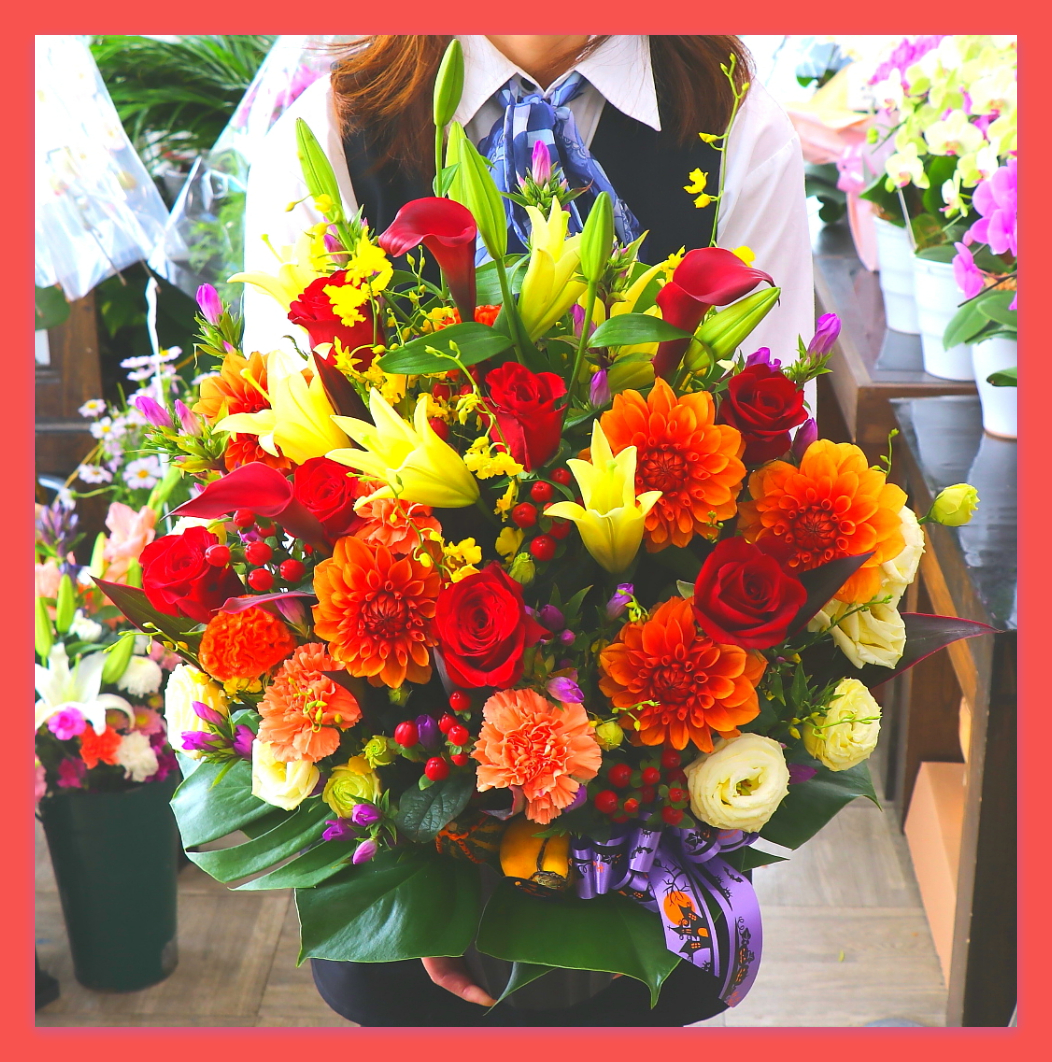 花材: メイン カボチャ、バラ、ダリア、カーネーション、リンドウ、ユリ、実物類、葉物類など その他 綺麗に美しくラッピング致します。