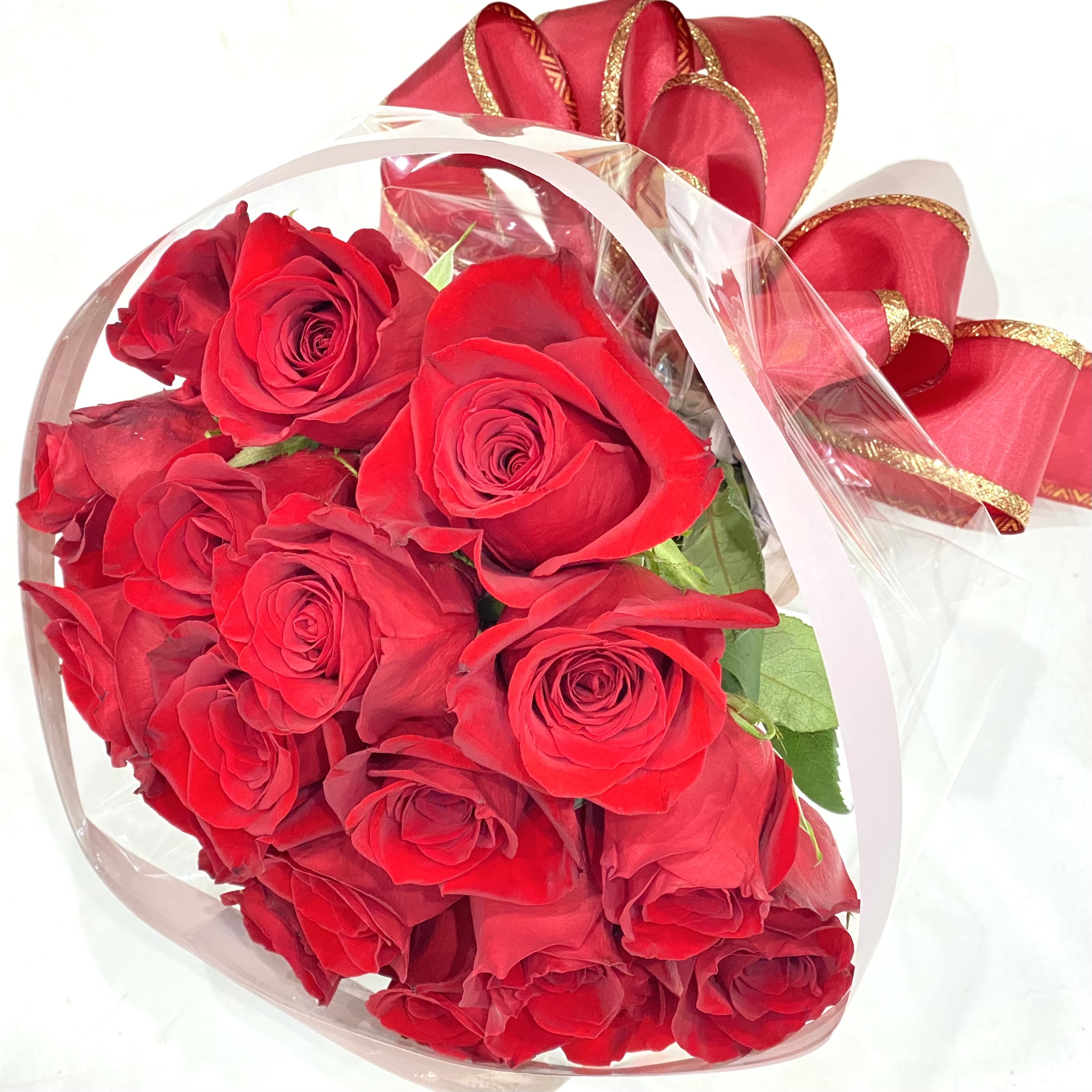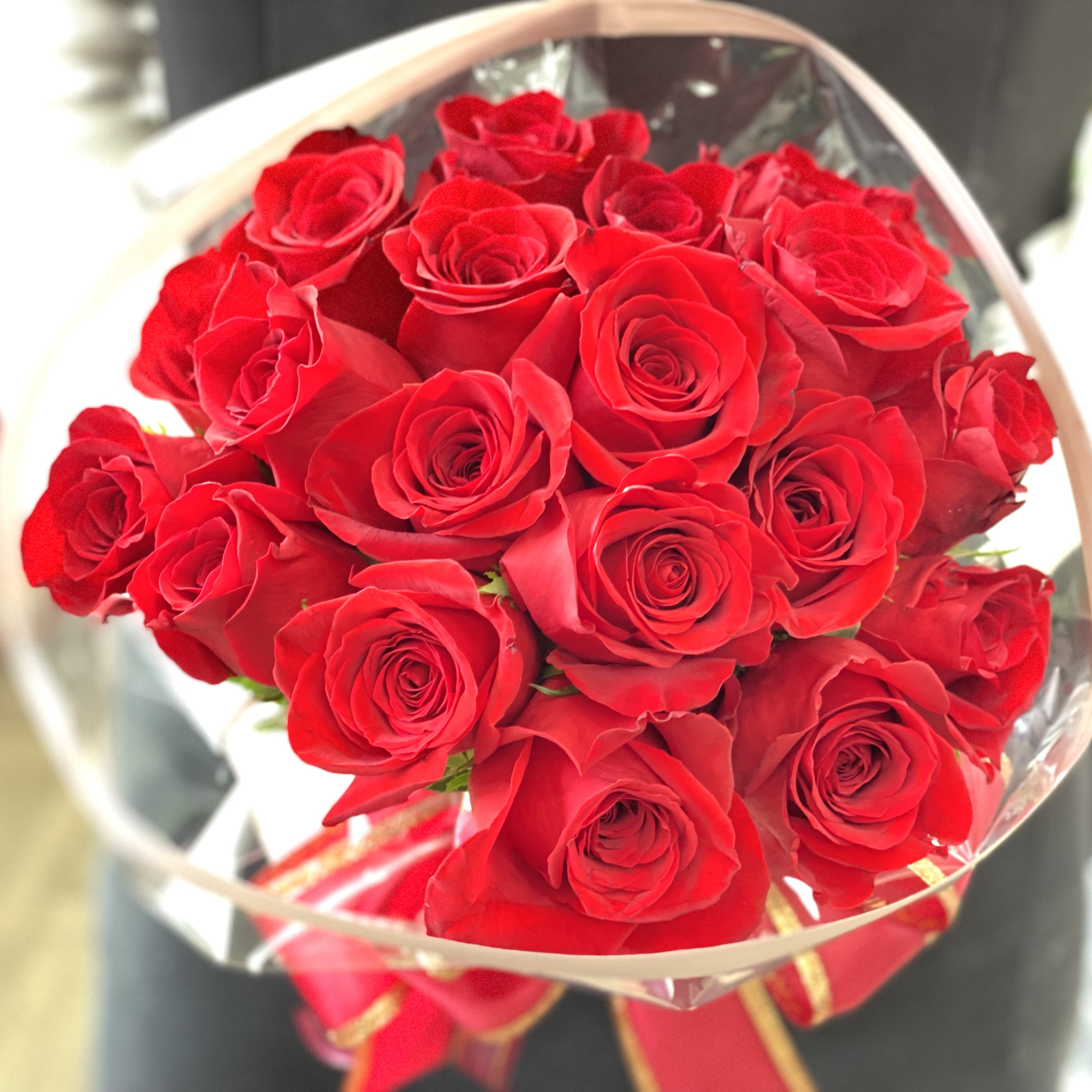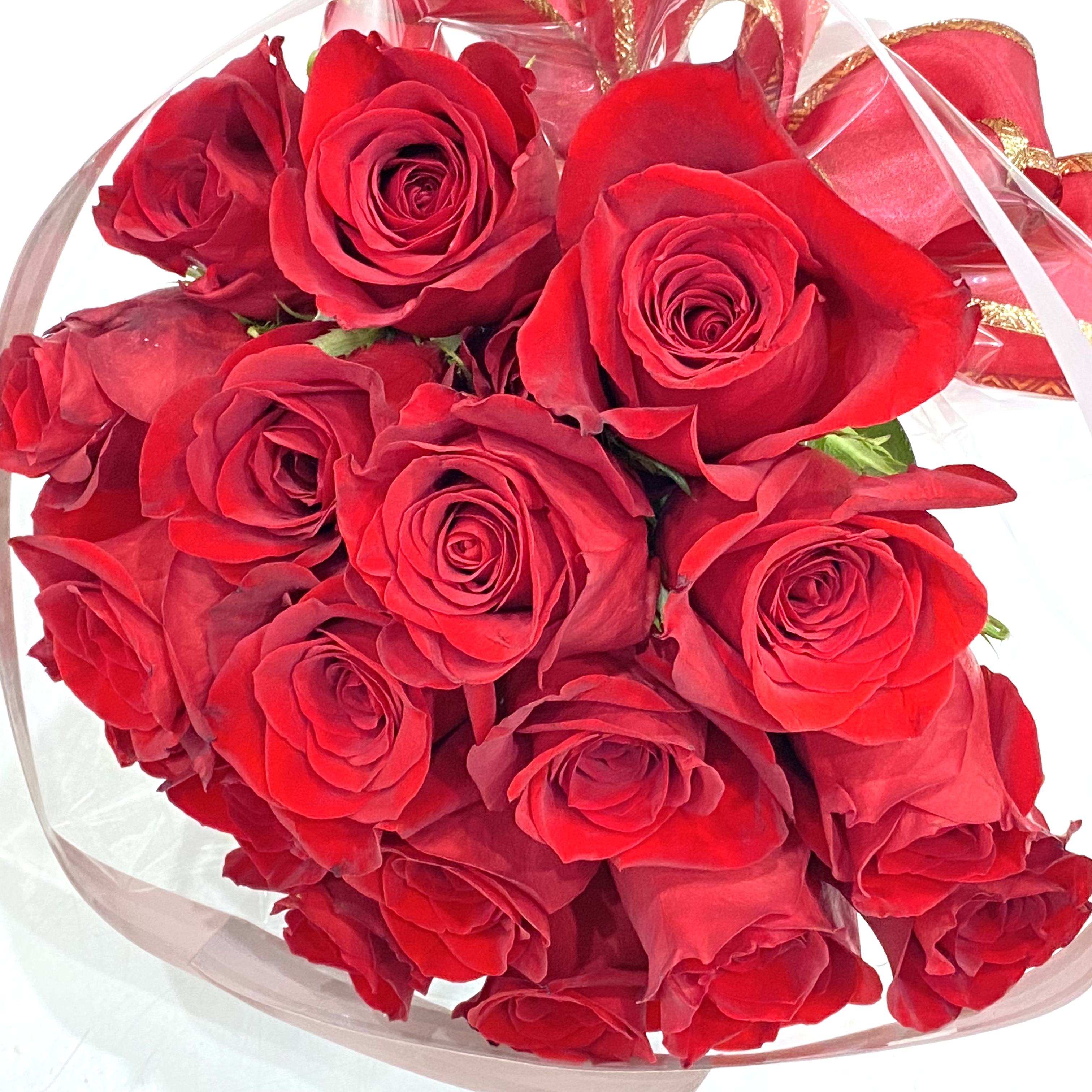 赤いバラを20本入れた可愛らしいブーケ風の花束。こじんまりと可愛らしくお洒落にプレゼントしたい方におすすめです。