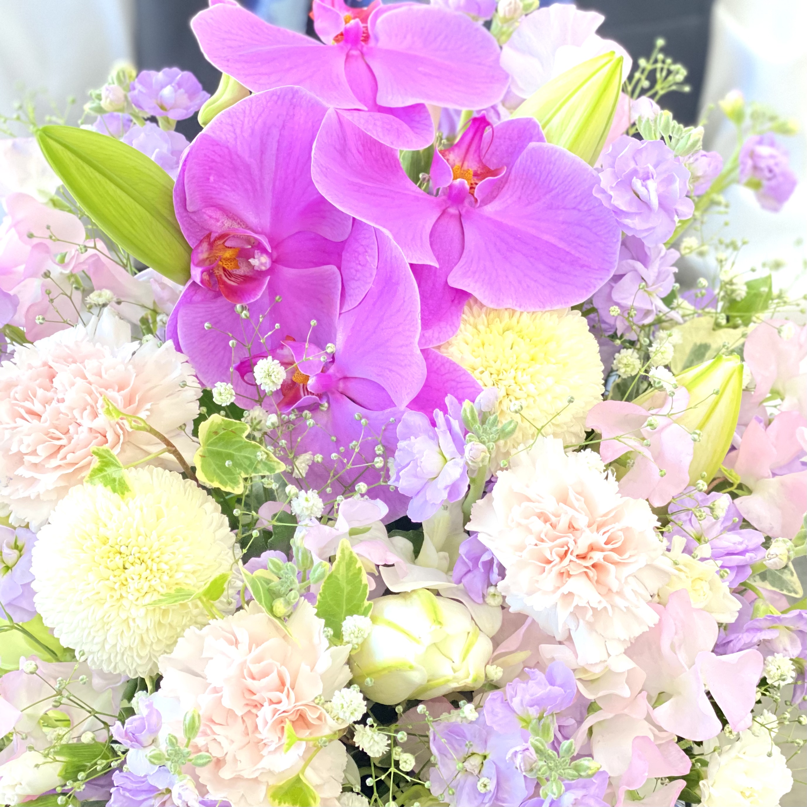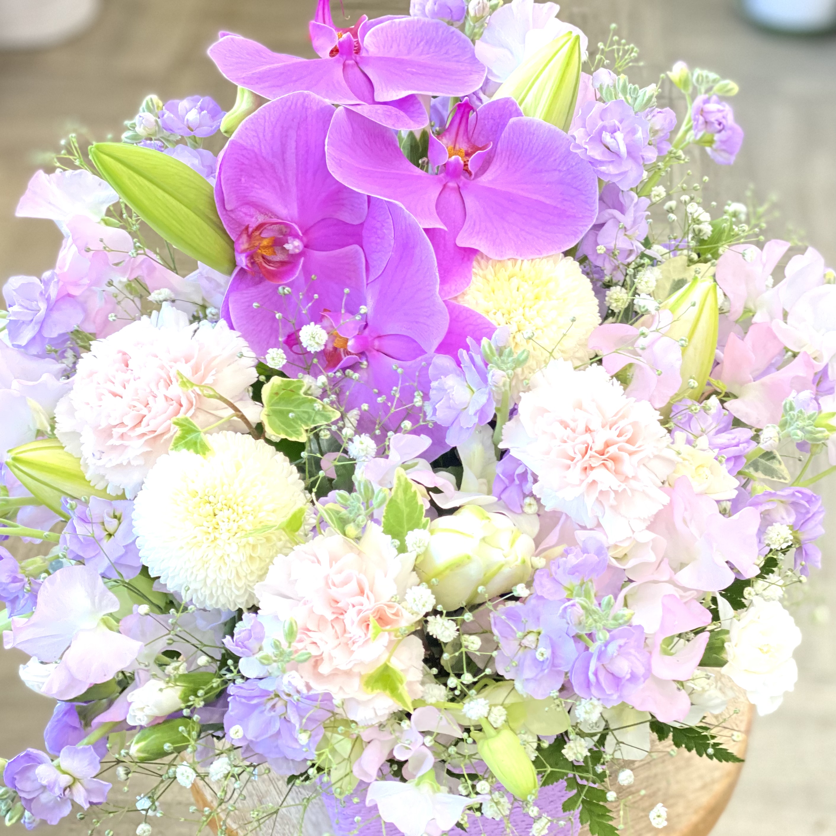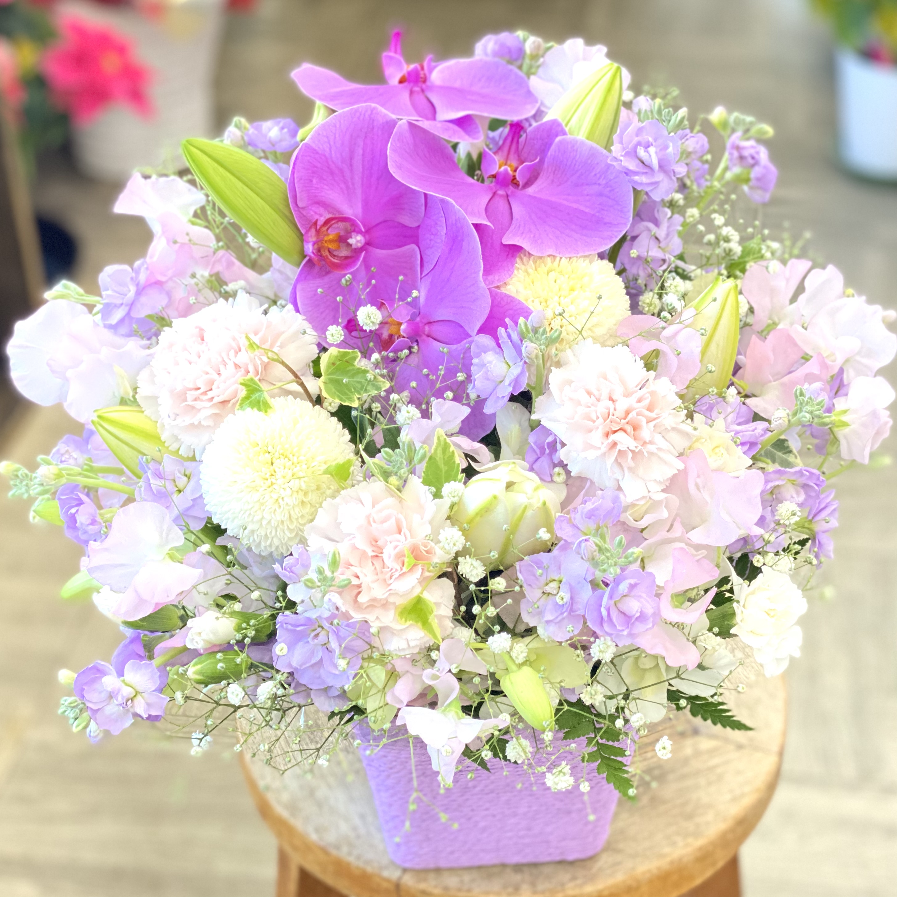 花材: メイン コチョウラン、ユリ、スイートピー、カーネーション、ピンポンマム、かすみ草など その他 葉物類など