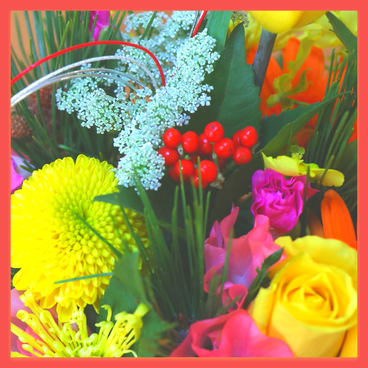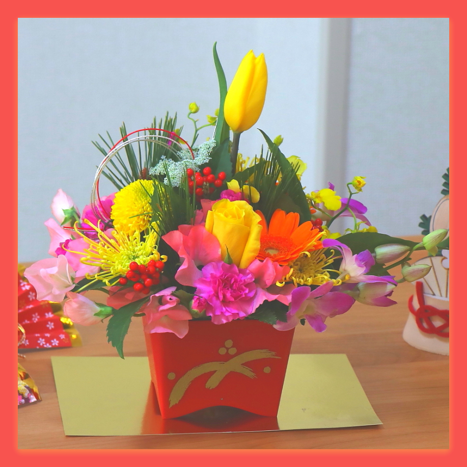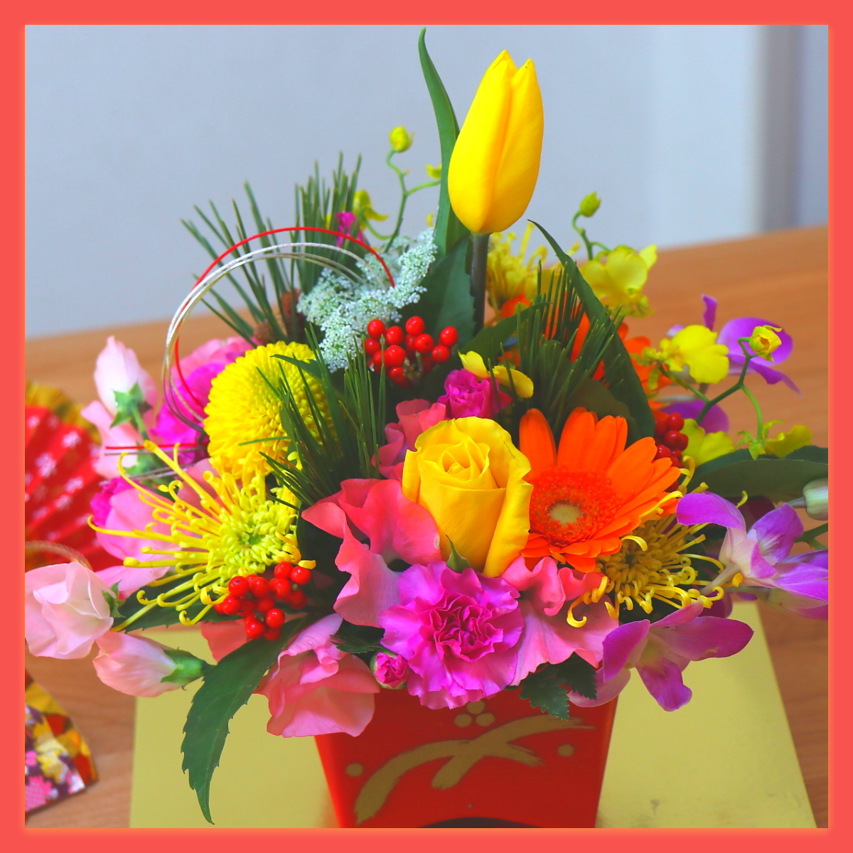 花材: メイン 松、千両、チューリップ、スイートピー、バラ、ガーベラ、ミニカーネーションなど その他 季節のお花、葉物類など