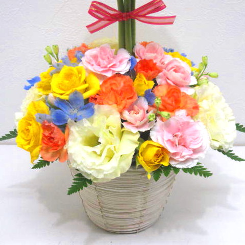 【ガーベラ】をトップに4本を入れ、色とりどりのお花で明るくオールラウンドで制作。どこから見ても綺麗に見えます。きっととびっきりに喜んでいたただけると思います。当店ではお客様の想い大切に【こころを込めて】お作りいたします。静岡県長泉町から手渡しお届けまたは宅急便で全国にお届けします。是非、さまざまな贈り物に。