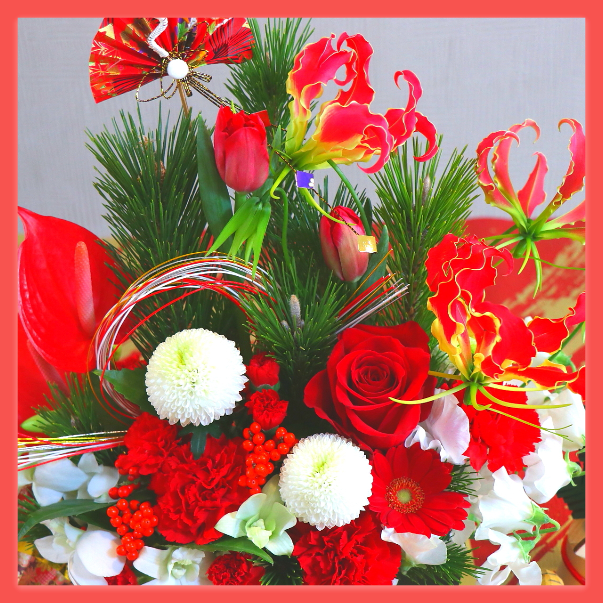 新年を迎えるのにふさわしい華やかなお正月アレンジメント。紅白色の色合いはご自宅で飾ってもよし!お年賀で贈ってもきっと喜ばれます!また、この時期のさまざまなお祝いシーンにおすすめです。【15時迄のご注文で翌日届きます】※こちらの商品についてのご相談、ご質問等ございましたら(メール)または(お電話)にて承ります。