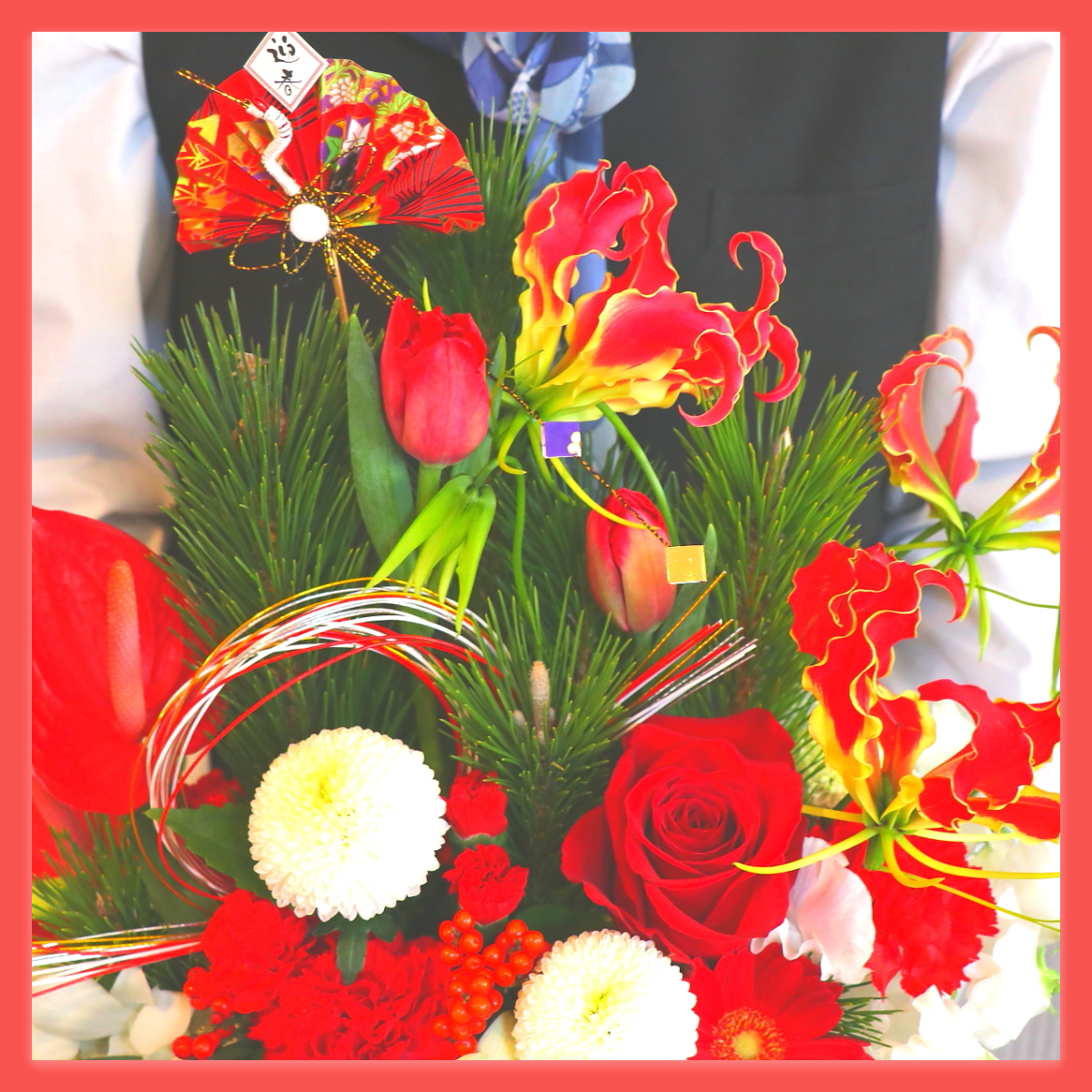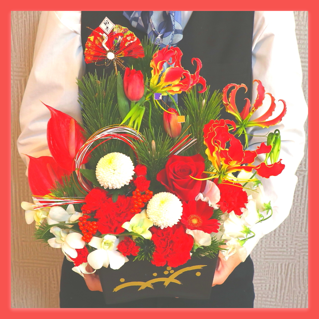 花材: メイン 松、千両、マム、バラ、ガーベラ、カーネーション、アンスリューム、スイートピー、デンファレなど その他 葉物類など