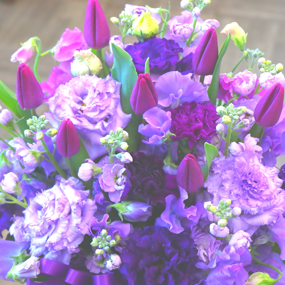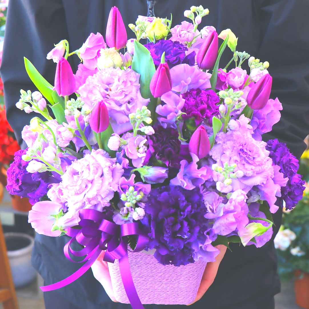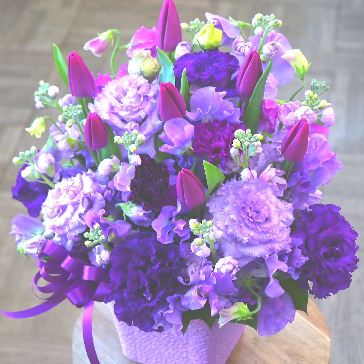 この時期にピッタリな「チューリップ」「スイートピー」をふんだんに使った春の紫系のアレンジメントです。まるで宝石のような高級感のある色合いはきっと感動を与えてくれますよ!もちろん厳選した花材を使用しておりますので、ご利用されたお客様から「大変花持ちが良い」と好評ですよ。あなたの大切な人へ…心を込めてこのアレンジを贈ってみてはいかがですか。さまざまなご用途にお使いいただけますよ。